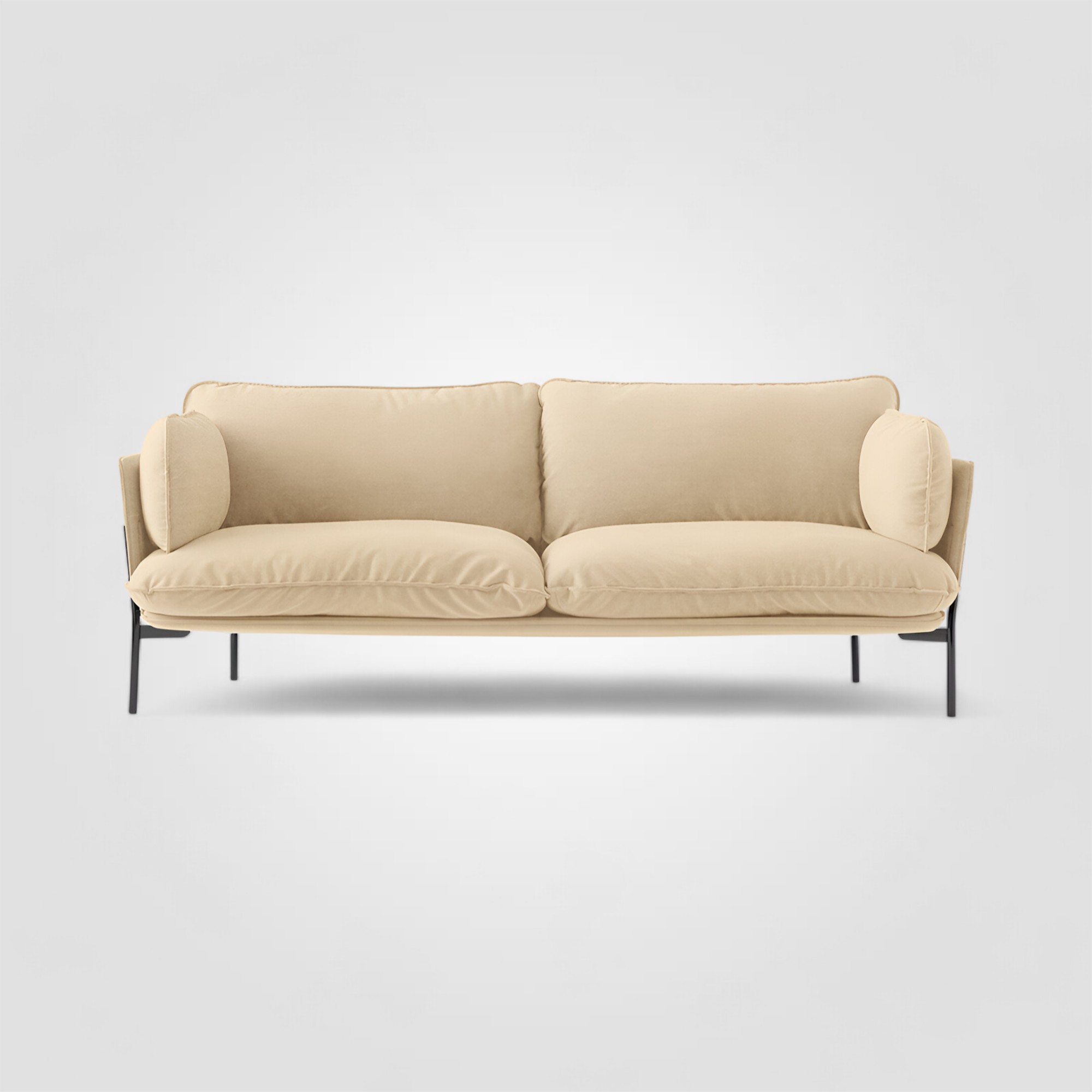 Мягкий и объемный диван с ультратонкими ножками, создающими эффект легкости и парения. Диван будто приглашает вас провести расслабляющий вечер с кино или вздремнуть после работы. Воздушные подушки спинки, подлокотников и сиденья легко снимаются и обеспечивают максимальный комфорт. Жесткий каркас балансирует мягкие формы и сохраняет структуру силуэта. А изысканная обивка из приятной на ощупь экозамши светло-бежевого цвета, позволяет дивану уместно смотреться в современном интерьере, гармонируя с любой цветовой гаммой.