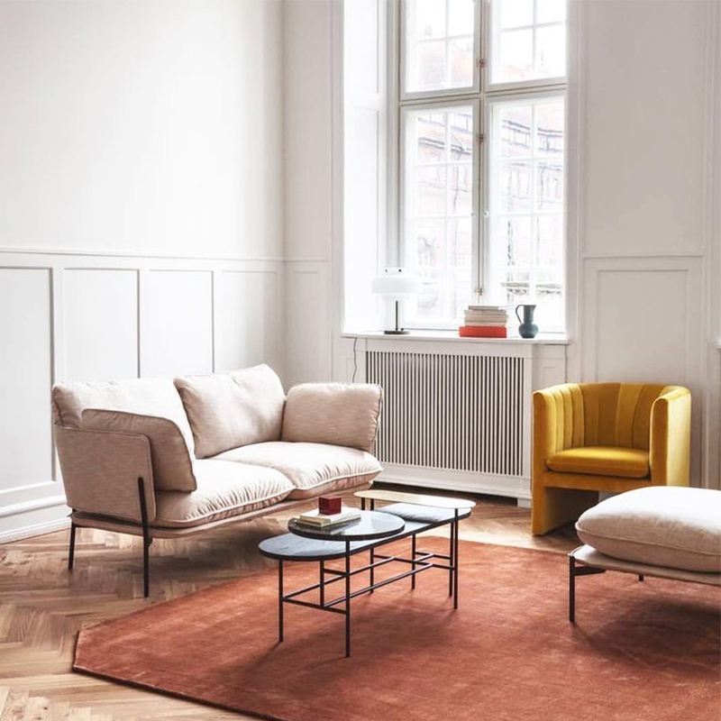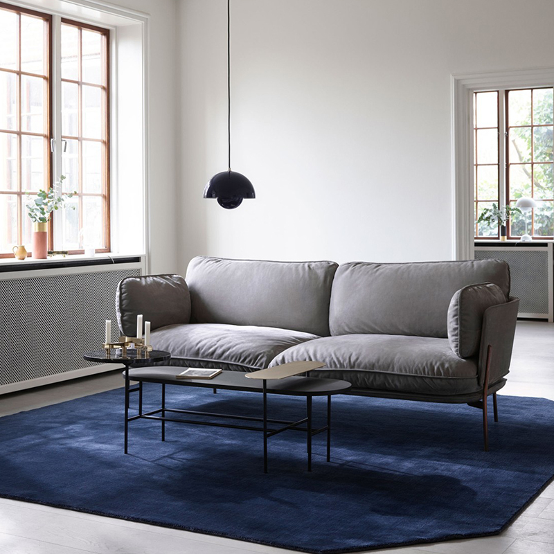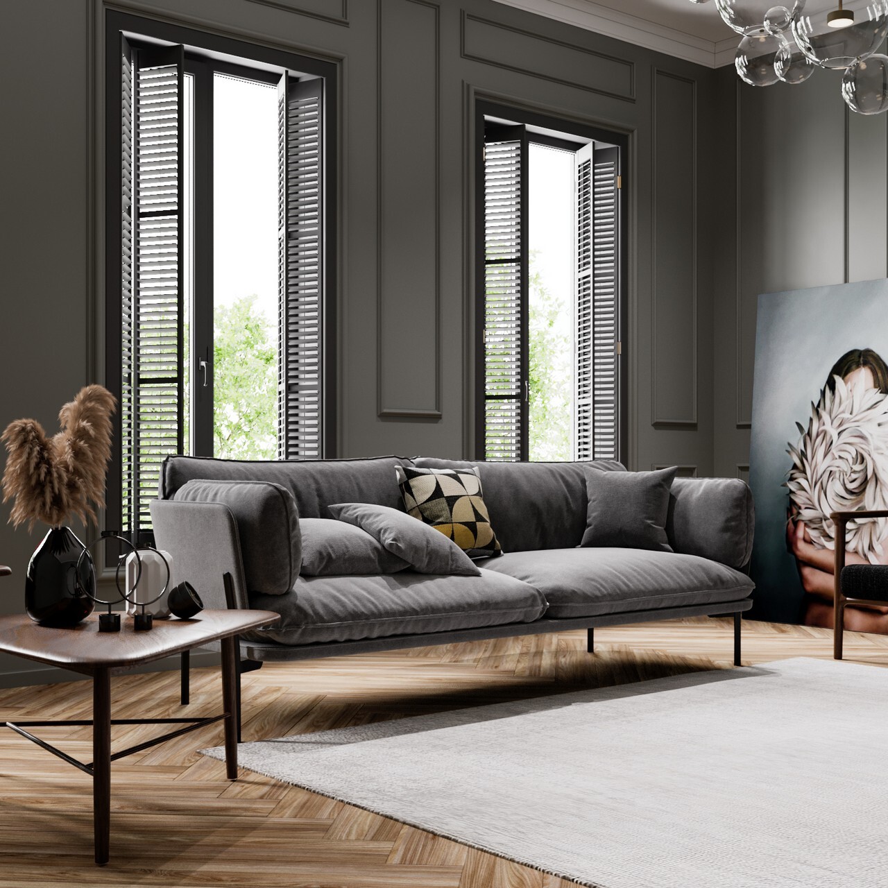 Просторный двухместный диван с тонкими металлическими ножками, которые создают эффект легкости и парения. Жесткий каркас в тканевой обивке формирует структуру силуэта модели и гармонично уравновешивает пышные, объемные подушки. Основание дивана зафиксировано скрытыми липучками, верхние подушки съемные.За счет практичной обивки в базовом светло-сером цвете диван послужит прекрасной основой организации зоны отдыха и выгодно подчеркнет цветовые акценты в интерьере.