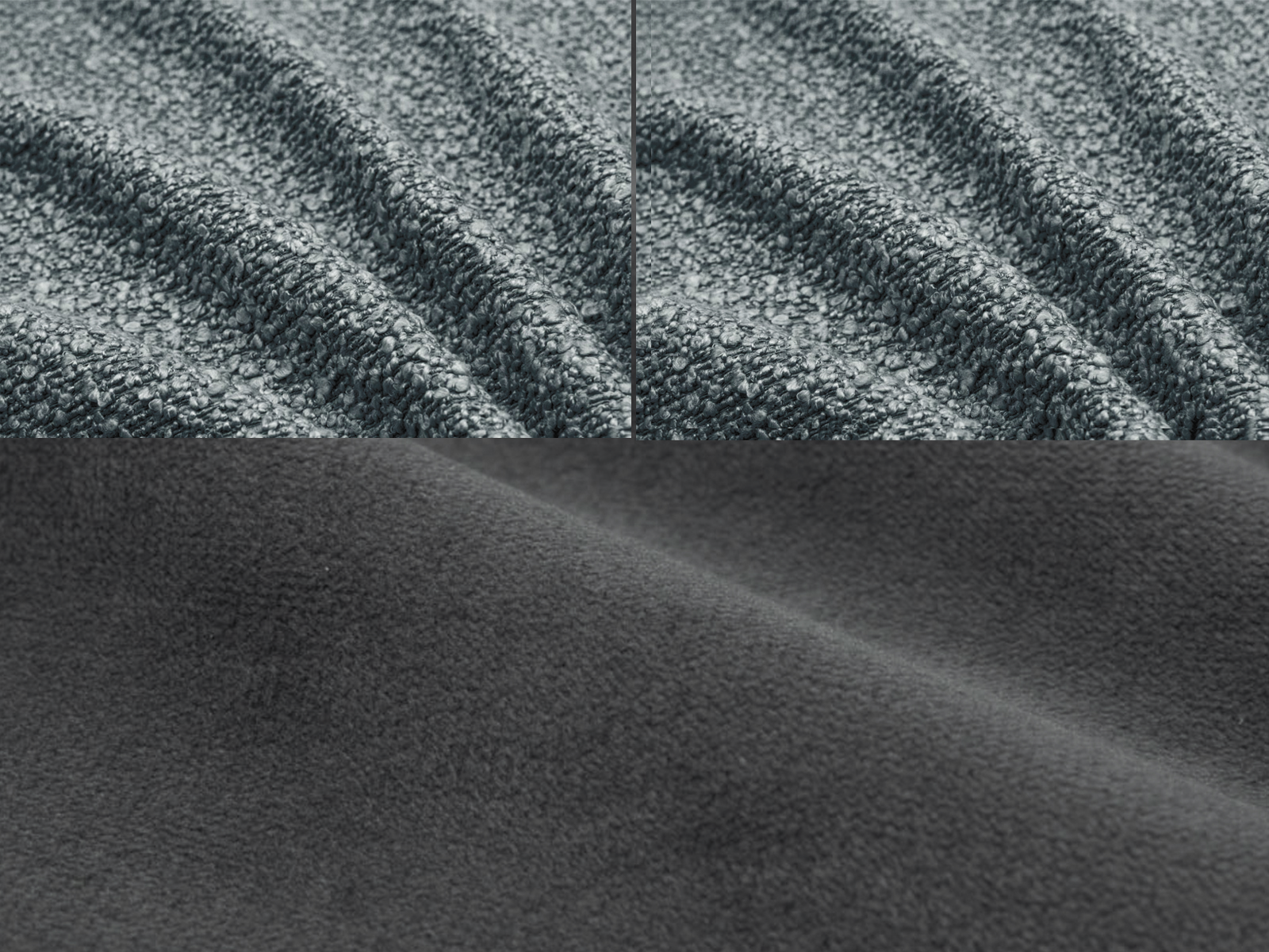 Обивка кровати: основа: высококачественный однотонный велюр цвета антрацит, и подушки в модном узелковом букле серого цвета.