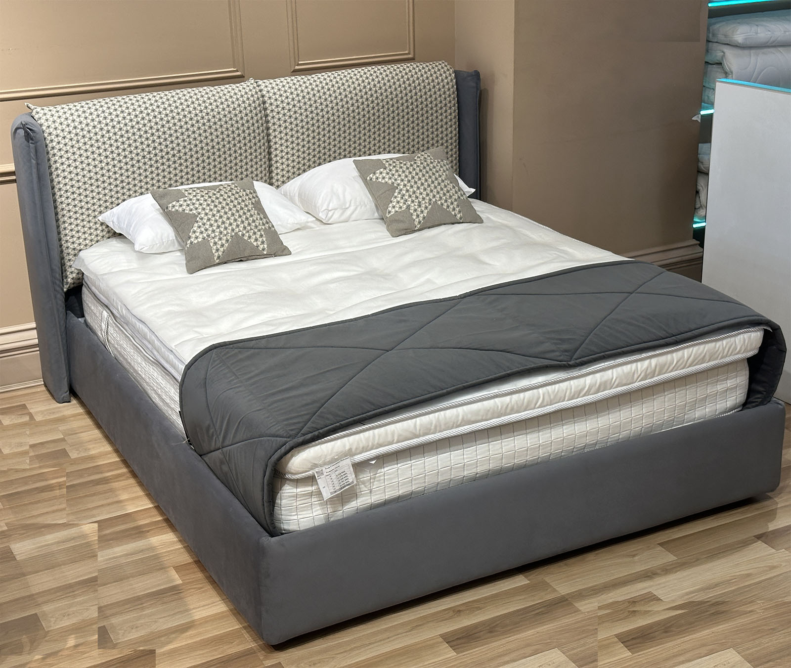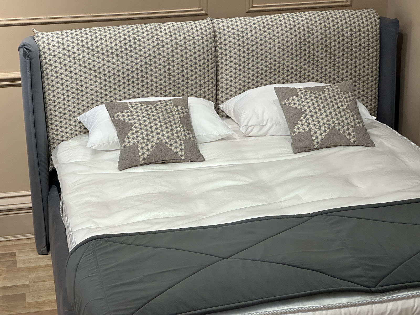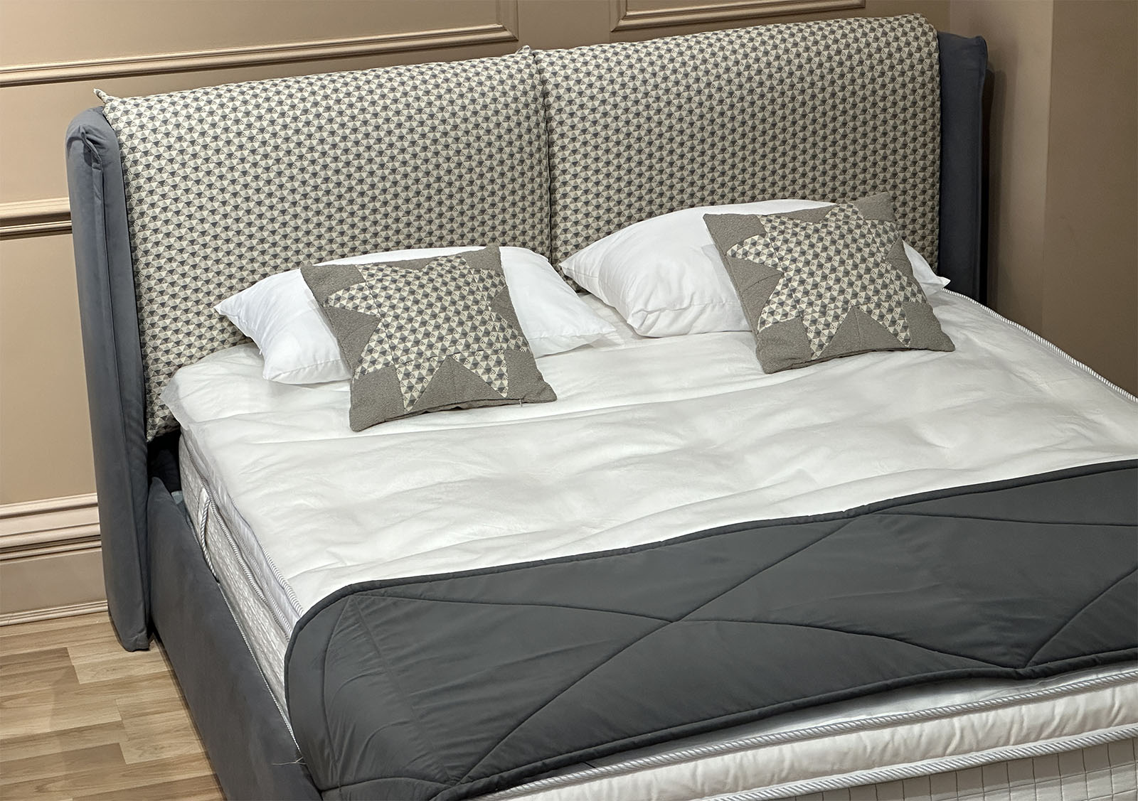 Обивка кровати: основа: высококачественный однотонный велюр цвета антрацит, и подушки с модным геометрическим рисунком в скандинавском стиле.