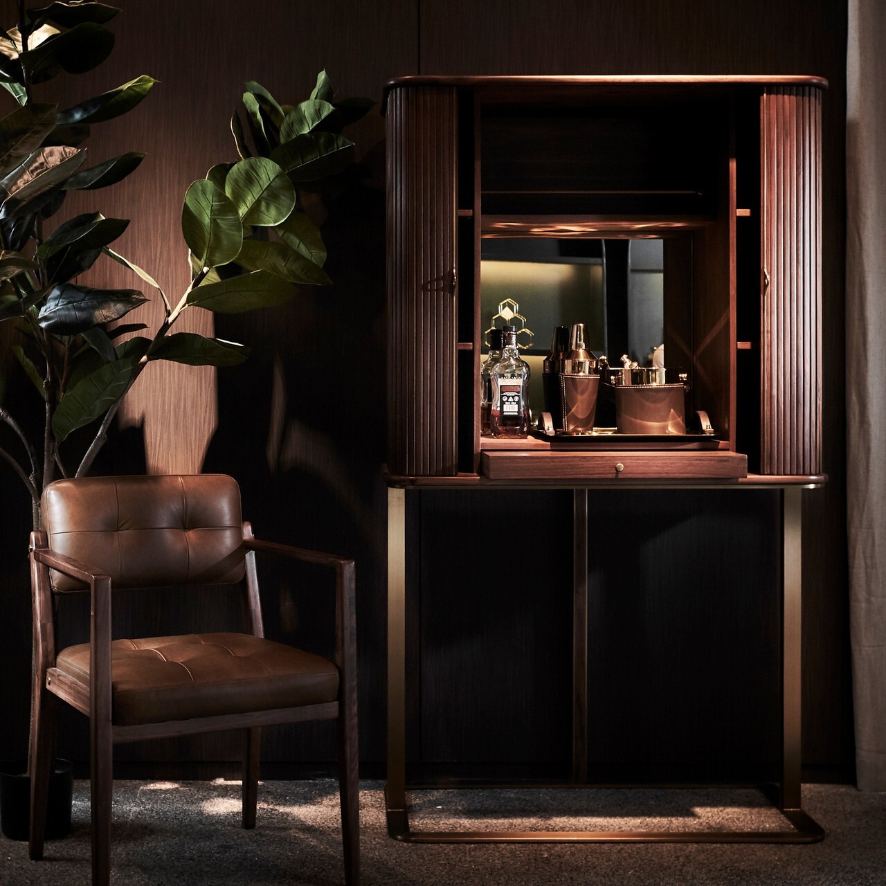 Изящный барный шкаф с нотками дизайна средних веков. Простые формы, точные и плавные линии создают ощущение легкости и элегантности. Теплая и гладкая поверхность из дерева гармонирует с устойчивыми опорами из металла цвета латуни. Скругленные углы сочетаются с четкими направленными линиями ножек, демонстрируя всю эстетику и красоту изделия. Уникальные разъезжающиеся дверцы экономят пространство и акцентируют внимание на содержании.Эта мебель гарантированно останется неподвластной времени. Искусность коллекции подчеркивается использованием натуральных материалов, обещая долговечность, сочетая суть со стилем и привнося в дом тепло и уют.