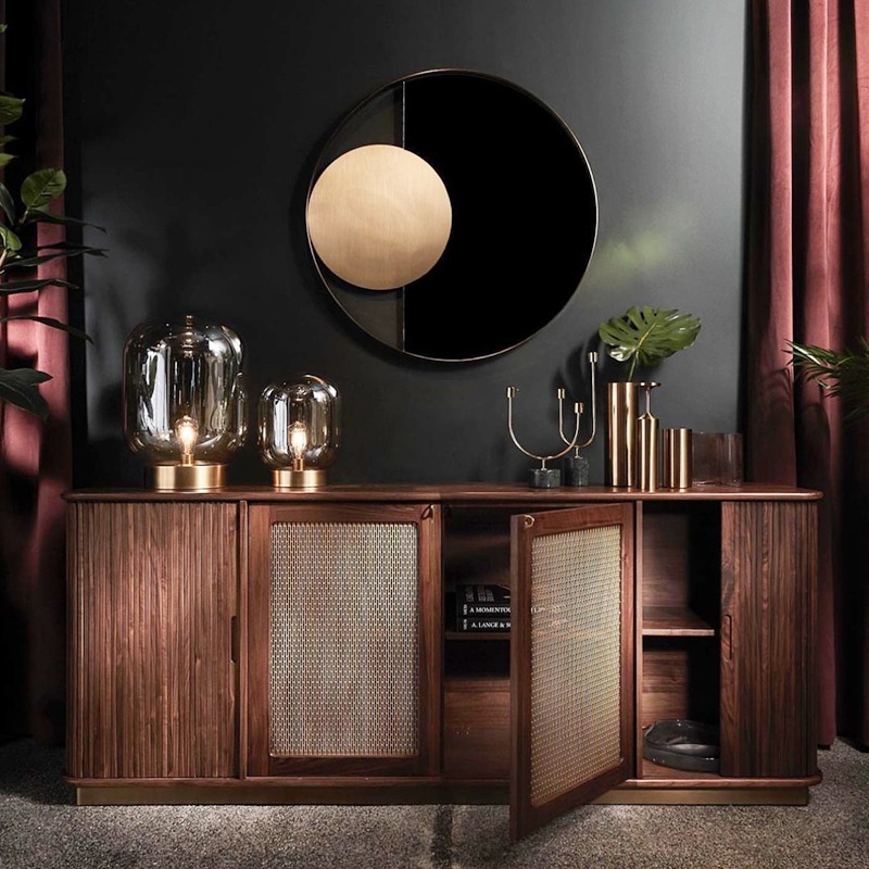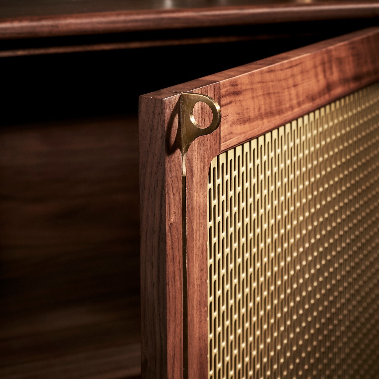 Коллекция Axel — простые формы, акцент на функциональность и ностальгия по классике 1950–1960-х годов.Шкаф-сервант из массива ореха и латуни со скругленными углами и сетчатыми дверцами.Это функциональная модель. На столешницу можно ставить декор или использовать в качестве тумбы под телевизор. Небольшие центральные ящики – для хранения необходимого: пульта для телевизора, настольных игр. Боковые ящики с разъезжающимися дверками – для важных вещей: документов, книг.  Дверцы по бокам экономят пространство за счет раздвижения вдоль фасада.Вся коллекция Axel