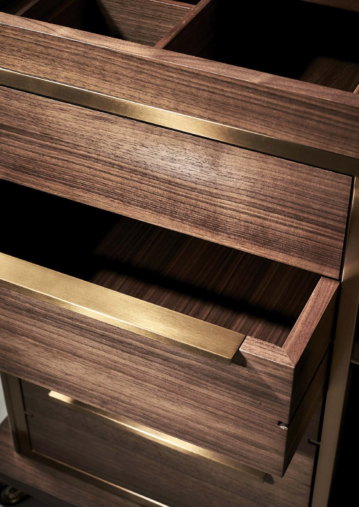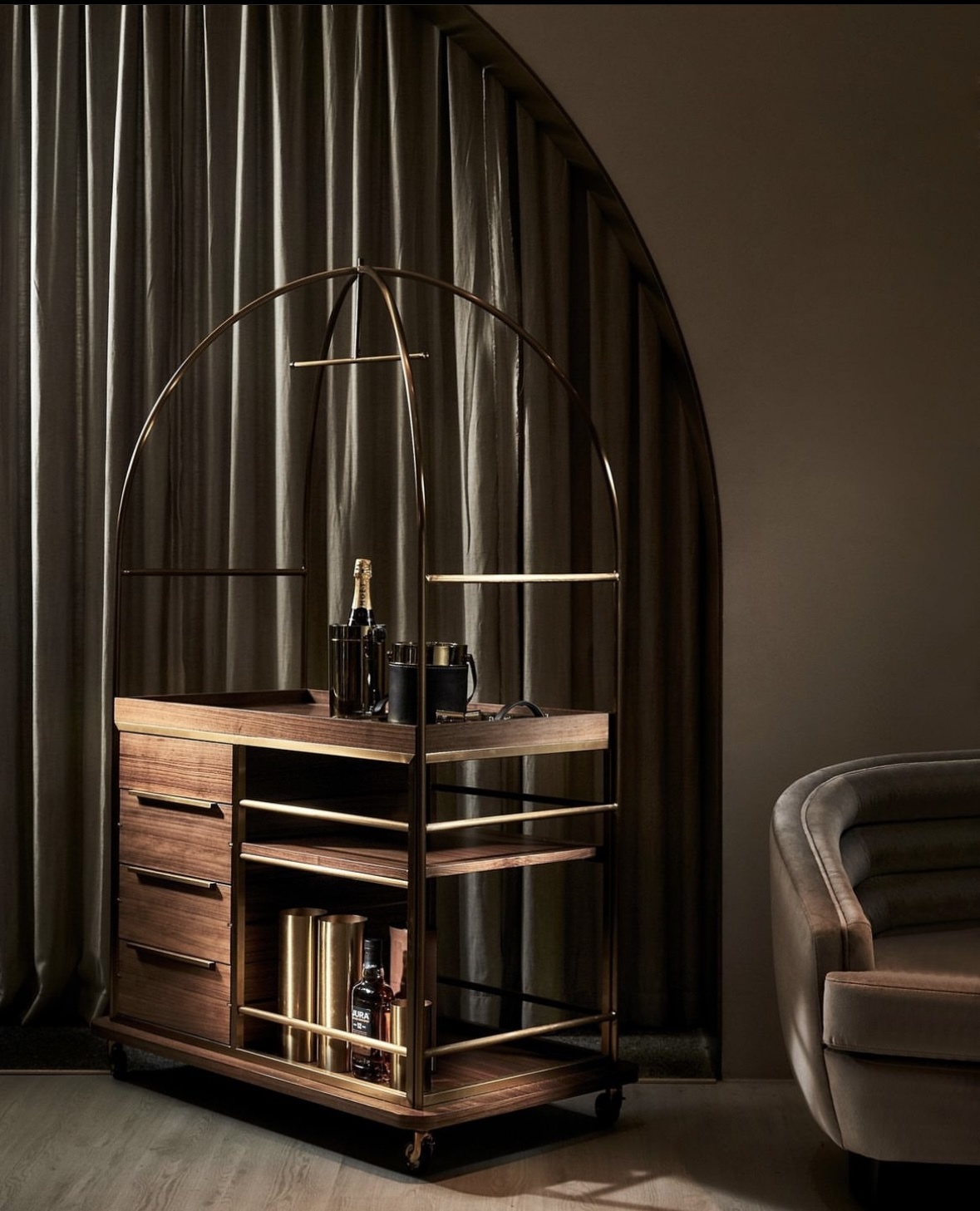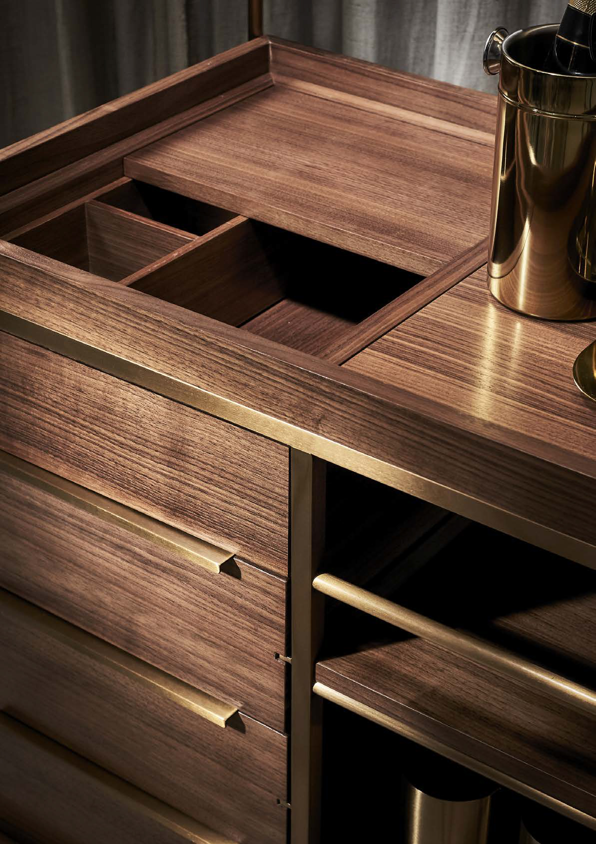 Барный шкаф на колёсиках, который порадует не только элегантным дизайном, но и удобством в использовании. Изготовленная из шпона грецкого ореха и дополненная элементами из латуни, барная тележка BARONET BAR CART предоставляет обширное пространство для хранения. Естественный ореховый оттенок легко впишется в интерьер кабинета или гостиной. Благодаря дизайнерской конструкции со встроенными колесиками можно легко перемещать бар. Изысканная конструкция тележки с плавными изгибами украсит как атмосферу званого ужина в гостиной, так и уютный вечер для двоих.