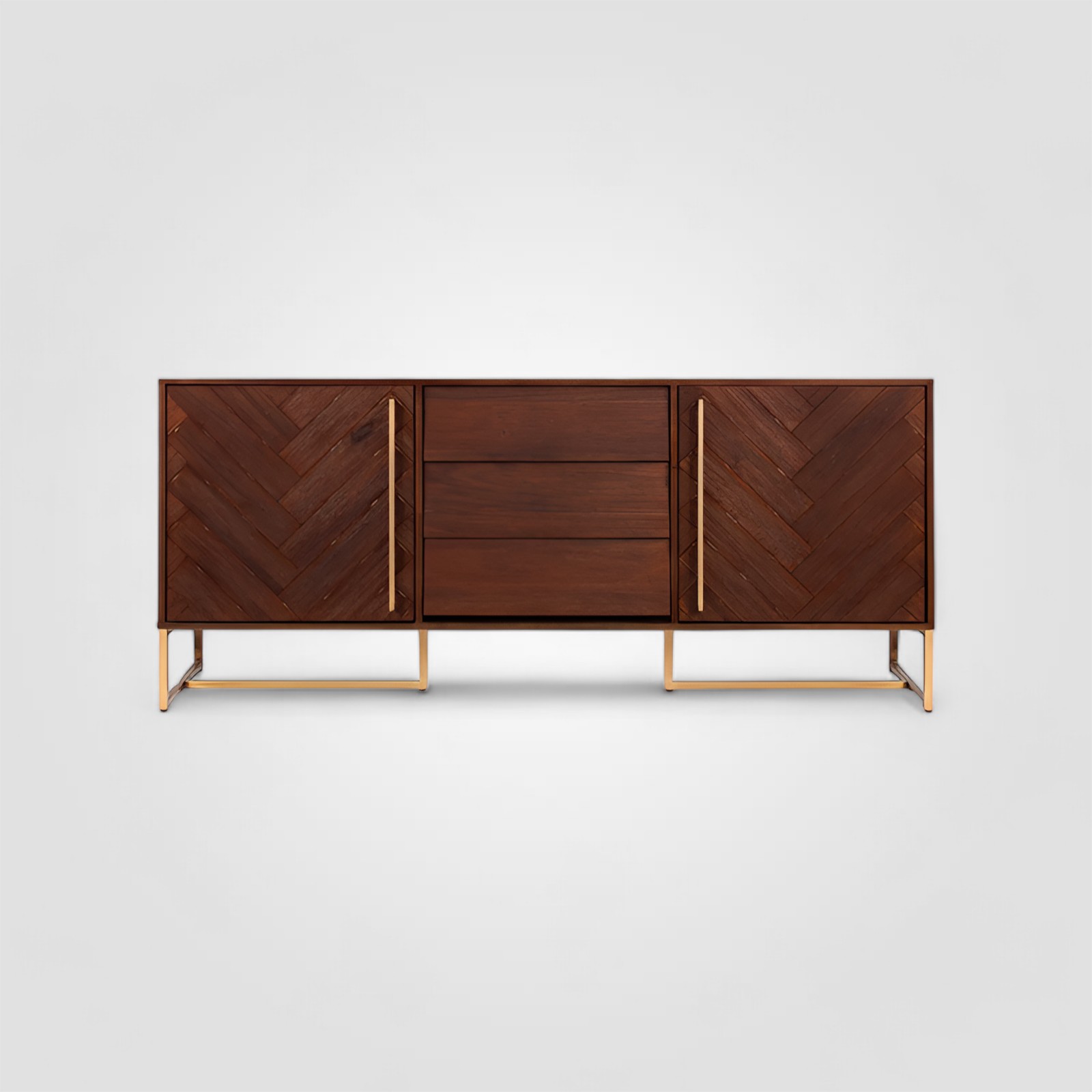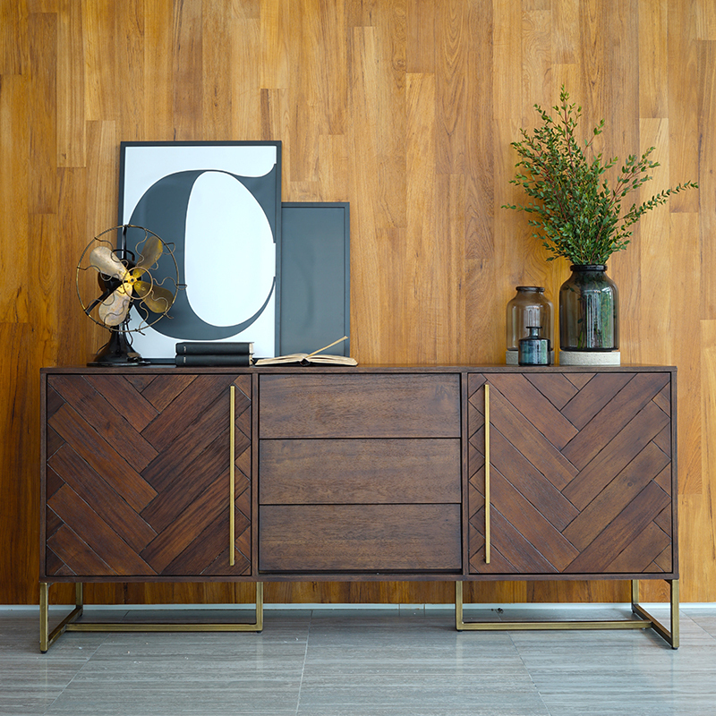Дизайнерский стол BRUNO выполнен из массива акации. Стол дополнен узорной отделкой «елочка» и элементами из состаренной латуни, отсылающими к эстетике винтажа и ар-деко. Коллекция BRUNO создана для тех, кто ценит элегантность прошлого. Дизайнеры выбрали акацию из-за неповторимого природного узора, который дарит исключительный характер каждому предмету мебели и делает интерьер неповторимым.