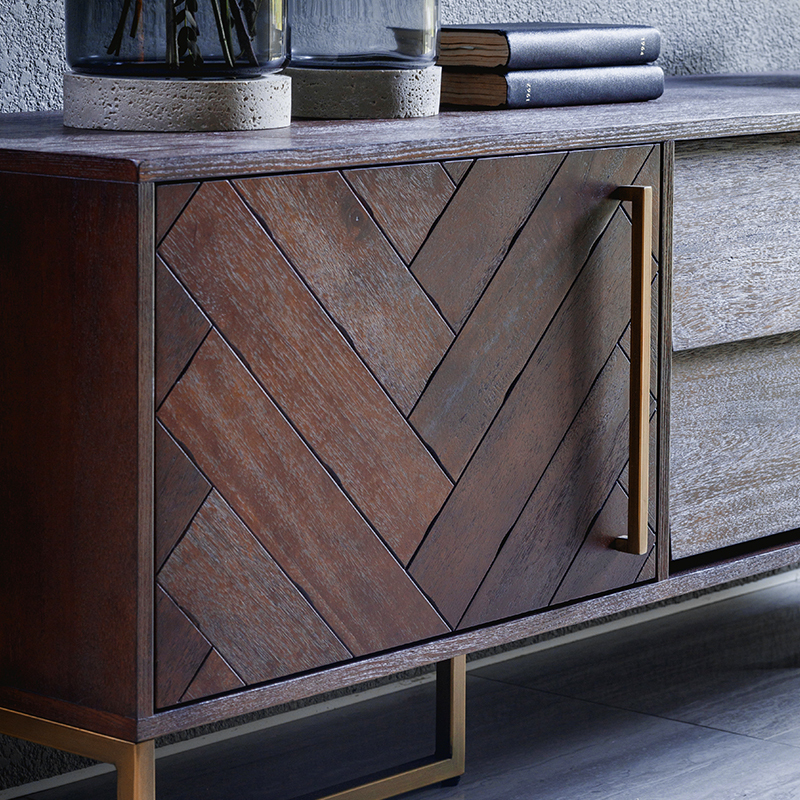 Тумба под телевизор из массива акации. Дверцы выполнены из шпона акации с узором «елочка» и декорированы металлическими ручками из металла цвета латуни. Современные винтажные элементы, подойдут тем, кто ценит изысканность и элегантность. Металлические ножки имеют регулируемые выравниватели.Вся коллекция BRUNO