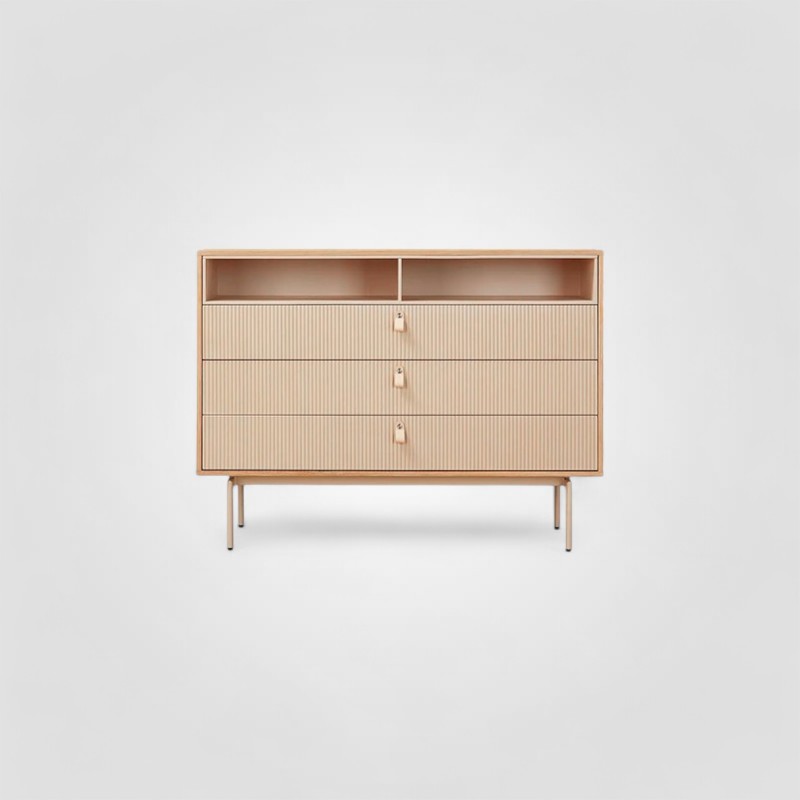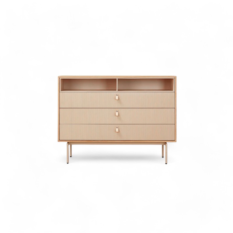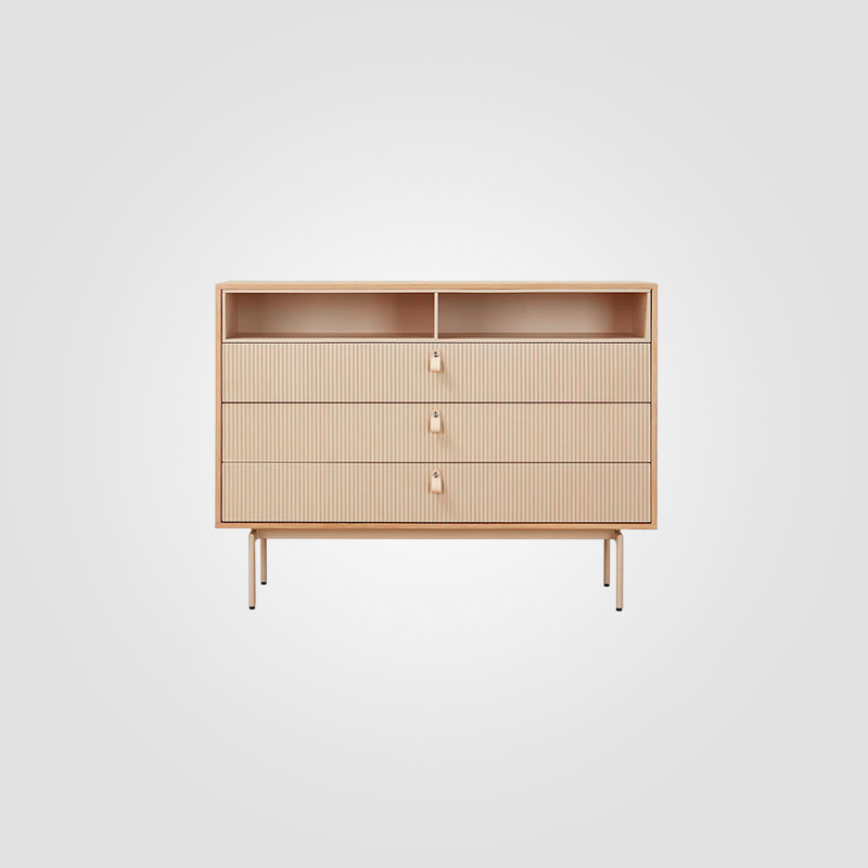 Комод из коллекции Creme — это воплощение очень актуального на сегодняшний день скандинавского стиля. Чёткие линии, рифленая поверхность ящиков, ручки-петельки из белой кожи, натуральный цвет дерева и тонкие ножки создают ощущение лёгкости и даже воздушности.