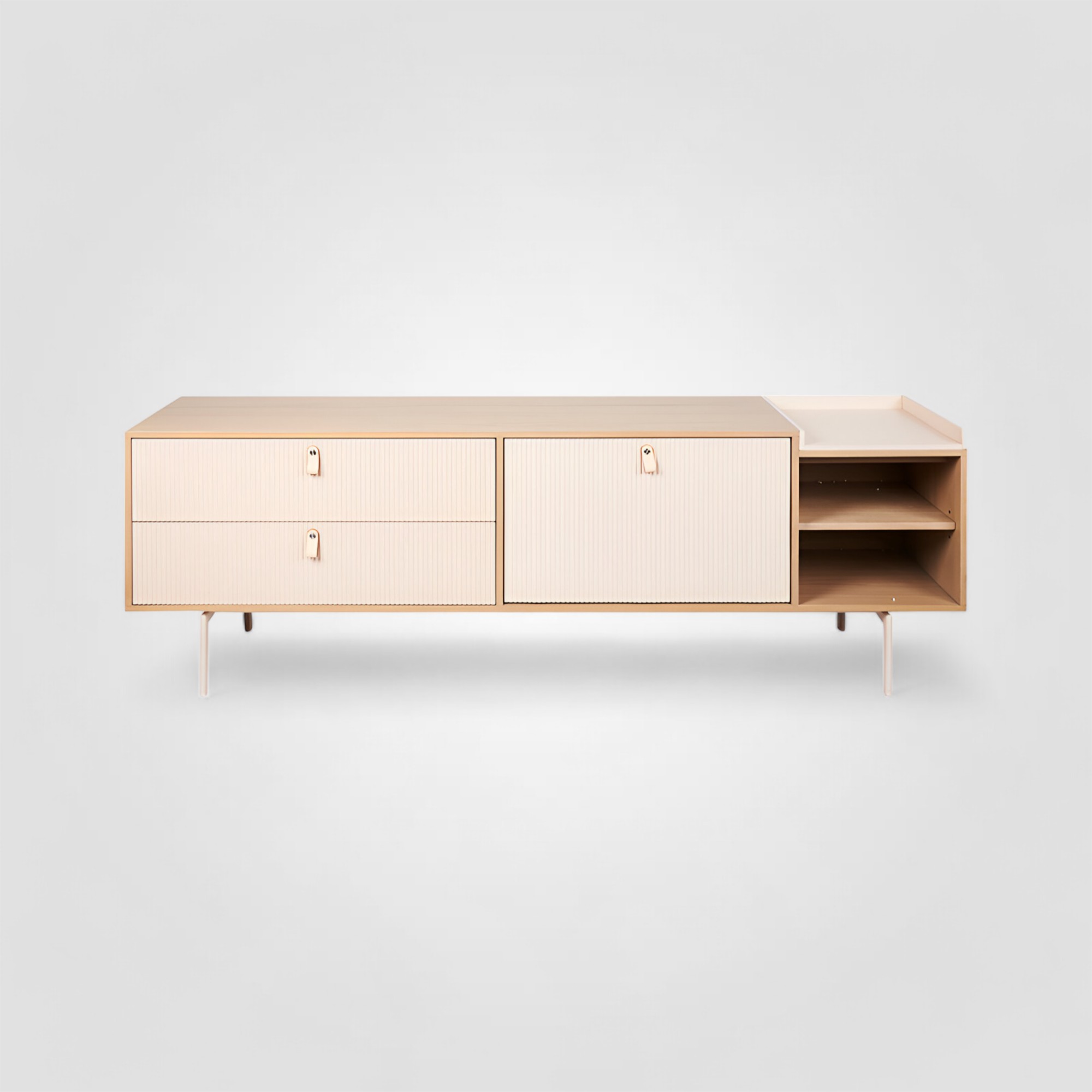 ТВ-тумба из коллекции Creme — это воплощение очень актуального на сегодняшний день скандинавского стиля. Чёткие линии, рифленая поверхность ящиков, ручки-петельки из белой кожи, натуральный цвет дерева и тонкие ножки создают ощущение лёгкости и даже воздушности. Такая ТВ-тумба подойдёт для оформления гостиной или спальни в современном стиле. В ней сочетаются красота и эргономика: TV-тумба Creme имеет 2 вместительных ящика, нишу с закрывающейся дверцей, а также открытые полки, где вы сможете разместить все важные мелочи. Сверху можно установить телевизор и колонки к нему или же расставить декор.Вся коллекция CREME