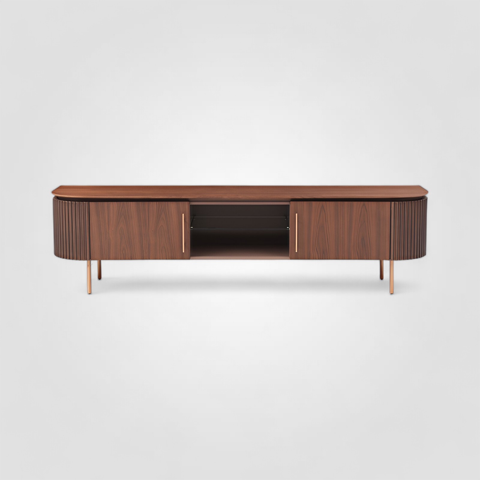 TV тумба MORISONE , выполненная из натурального шпона американского ореха, представляет собой идеальное сочетание качества и элегантности. Шпон создает теплую и природную атмосферу в любом интерьере.Ножки TV тумбы изготовлены из прочного металла, обеспечивая стабильность и надежность конструкции. Это также придает  TV тумбе MORISONE современный и стильный вид, гармонично сочетающийся с шпоном американского ореха.MORISONE оснащена стеклянными полками, которые не только визуально увеличивают пространство, но и позволяют организовать надежное и эстетичное размещение различной аудио-видео техники и аксессуаров. Это открывает широкие возможности для организации и структурирования своего домашнего кинозала или мультимедийного центра.Цвет ореха, присутствующий в тумбе, придает ей особый шарм и элегантность. Благодаря мягким оттенкам ореха, тумба гармонично сочетается с другими элементами интерьера, создавая ощущение стиля и уюта.Коллекция, в которой представлена данная тумба, включает в себя также комод, что позволяет создать единый и гармоничный дизайн вашего помещения. Оба элемента мебели прекрасно дополняют друг друга и создают единый стильный ансамбль.