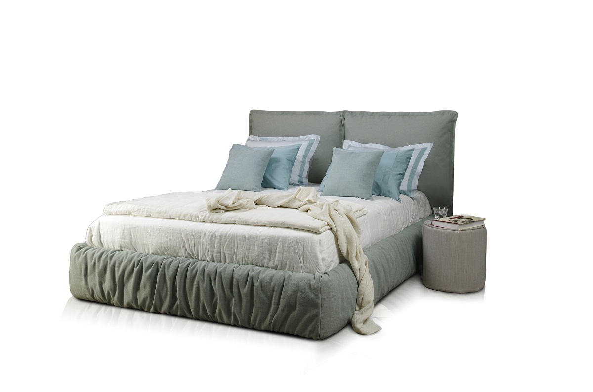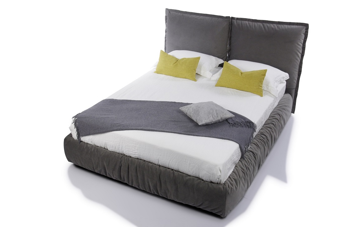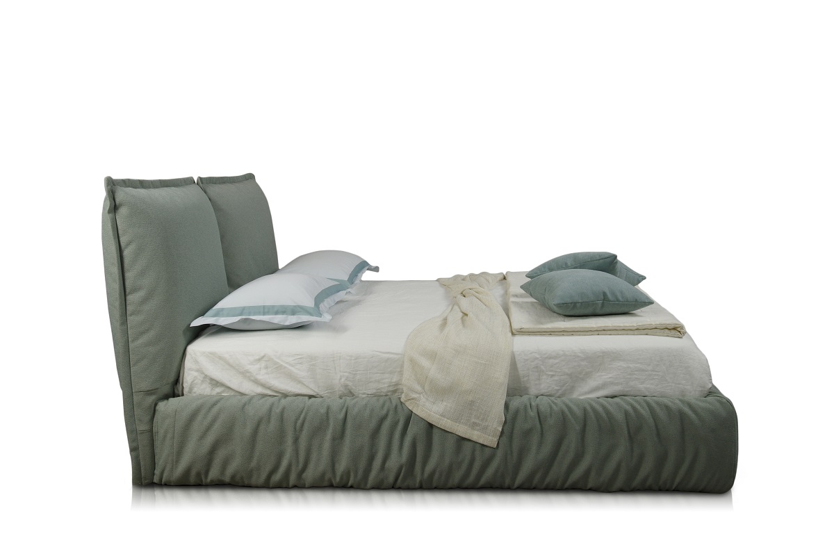 Caracteristici de design: un pat tapițat confortabil, voluminos, cu pereți laterali umflați și o pernă mare integrată ca tăblie.