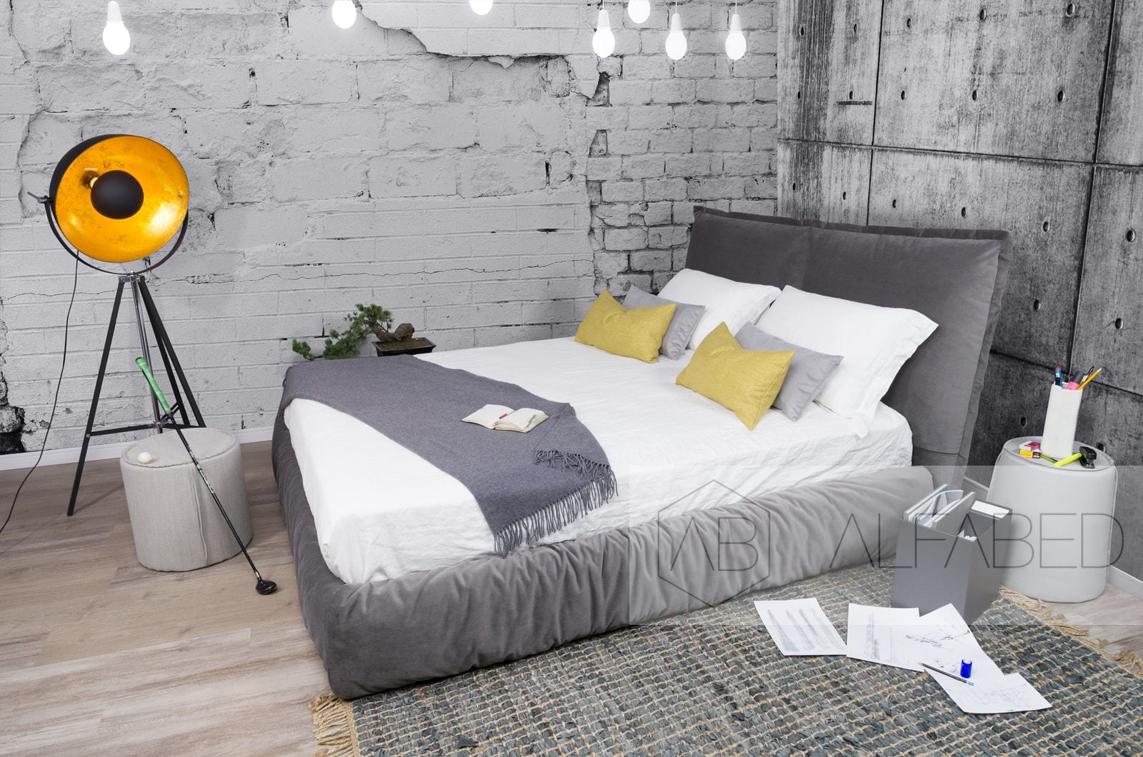 Caracteristici de design: un pat tapițat confortabil, voluminos, cu pereți laterali umflați și o pernă mare integrată ca tăblie.