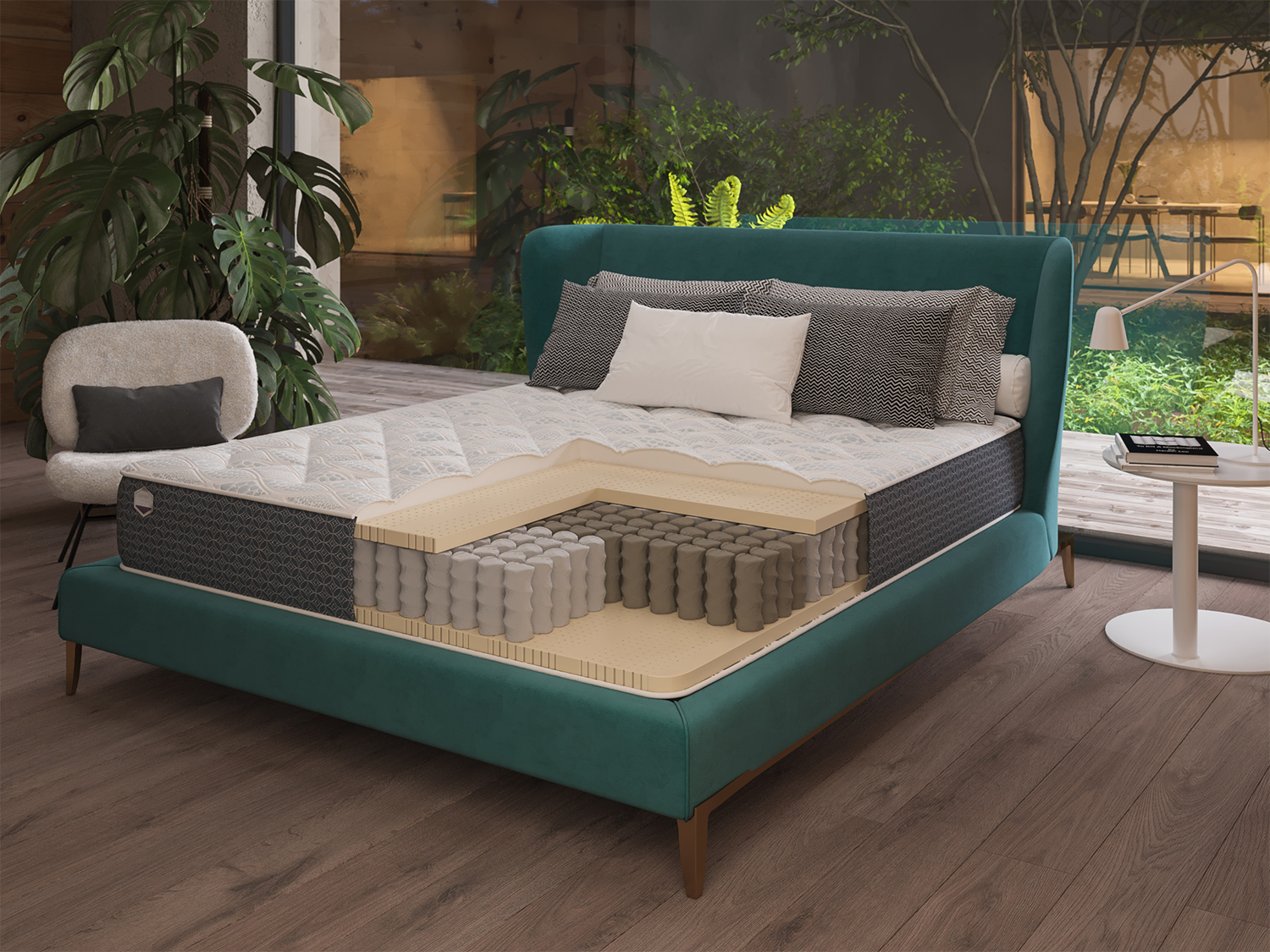 La bază – materiale de ultimă generație, fără plumb și formaldehide: stratul de bază – arcuri mini-pocket independente (688 de arcuri pe un loc de dormit) cu înălțimea de 14 cm, latex natural pe o parte și un strat inovator super-moale (aproximativ 4 cm) pe cealaltă parte.