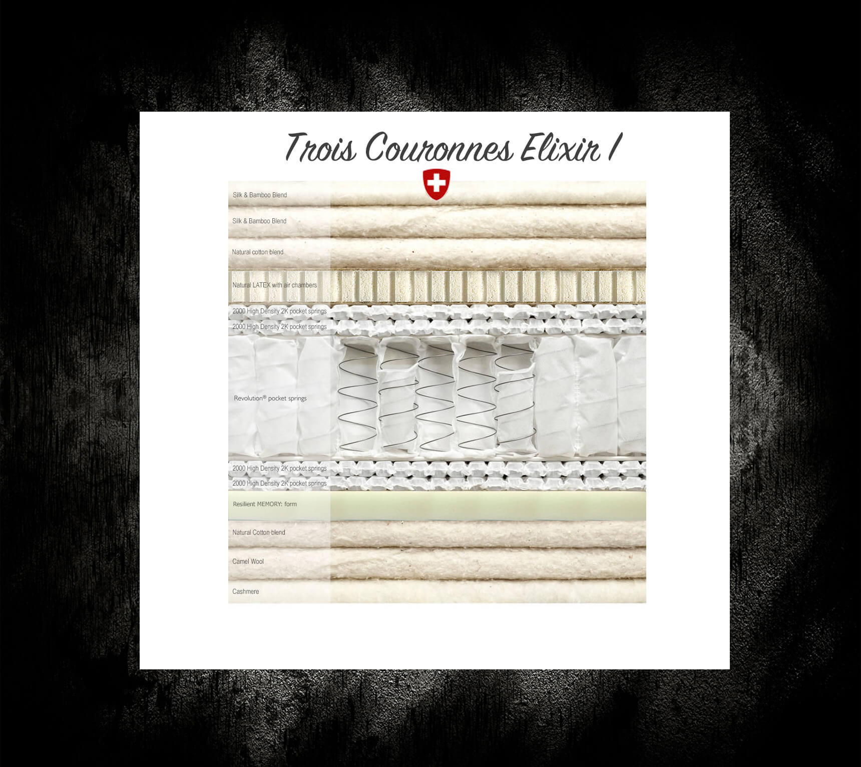 Salteaua Trois Couronnes Elixir I se bazează pe o construcție unică de arcuri duble independente Revolution® împreună cu un sistem de 2000 de mini-arcuri High Density® cu un diametru de 22 mm, care au fost supuse unui proces de întărire în cuptor pentru a le proteja de deformare și a permite producătorului să garanteze pe viață unitățile de arc din saltelele sale.