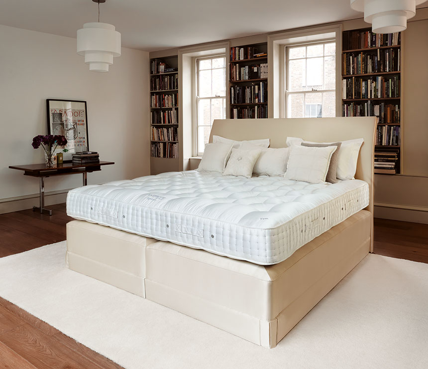 Saltea ortopedică de elită bazată pe un bloc de arcuri independente de diferite rigidități. Calitate 100% engleza. Designul este realizat pe baza unor blocuri cu arcuri așezate manual, cusute în huse calico. Există 3256 de arcuri pe o saltea de 182 cm x 200 cm. Umplutură naturală exclusivă: un amestec de coadă de cal pieptănată manual cu fleece și bumbac Shetland autentic certificat Platinum. Teak de înaltă calitate. Ciucuri și sfoară de lână tricotate manual. Marginile interioare sunt acoperite cu fibră de cocos și lână. Cusătură manuală pe 4 rânduri. Mânere orizontale pentru transport ușor.