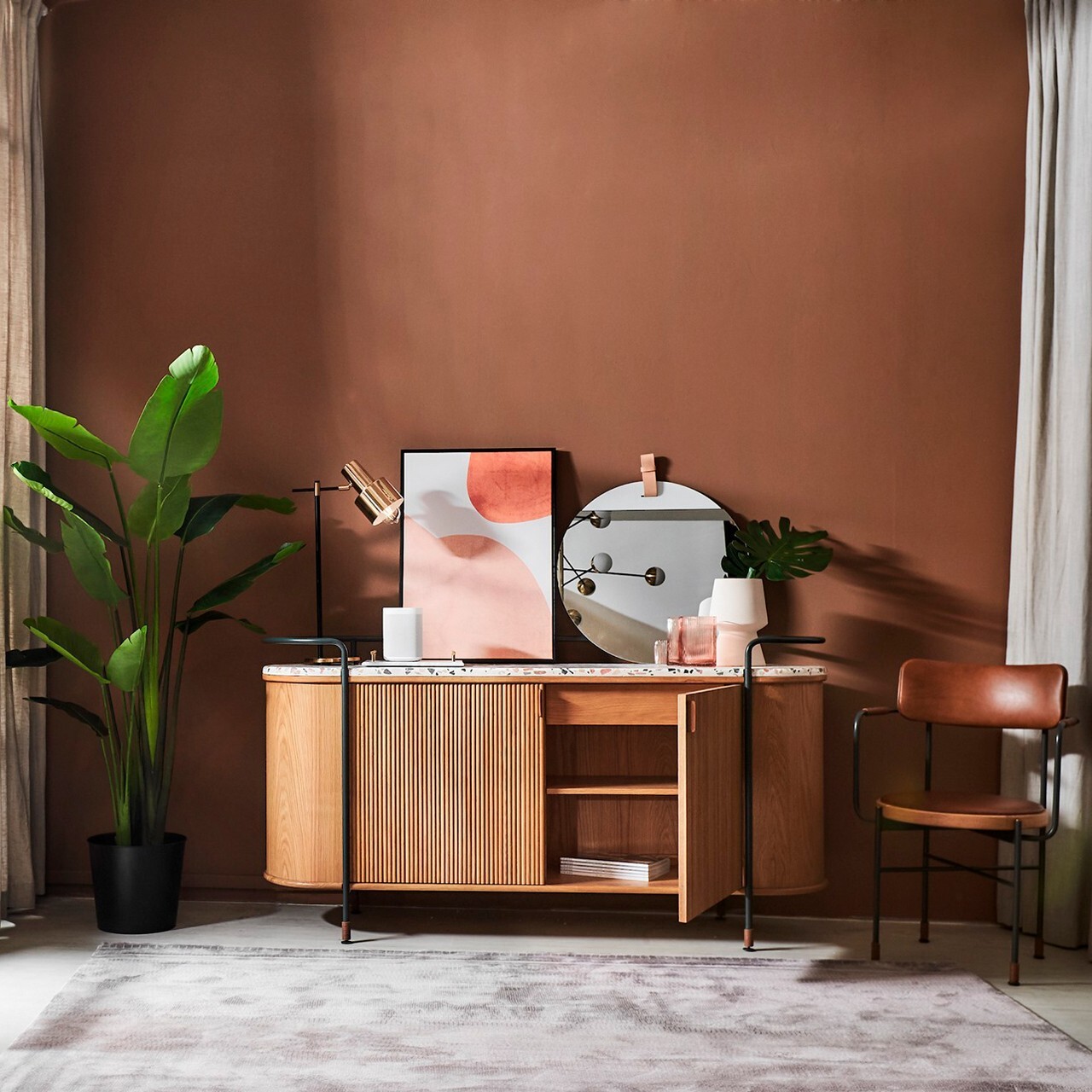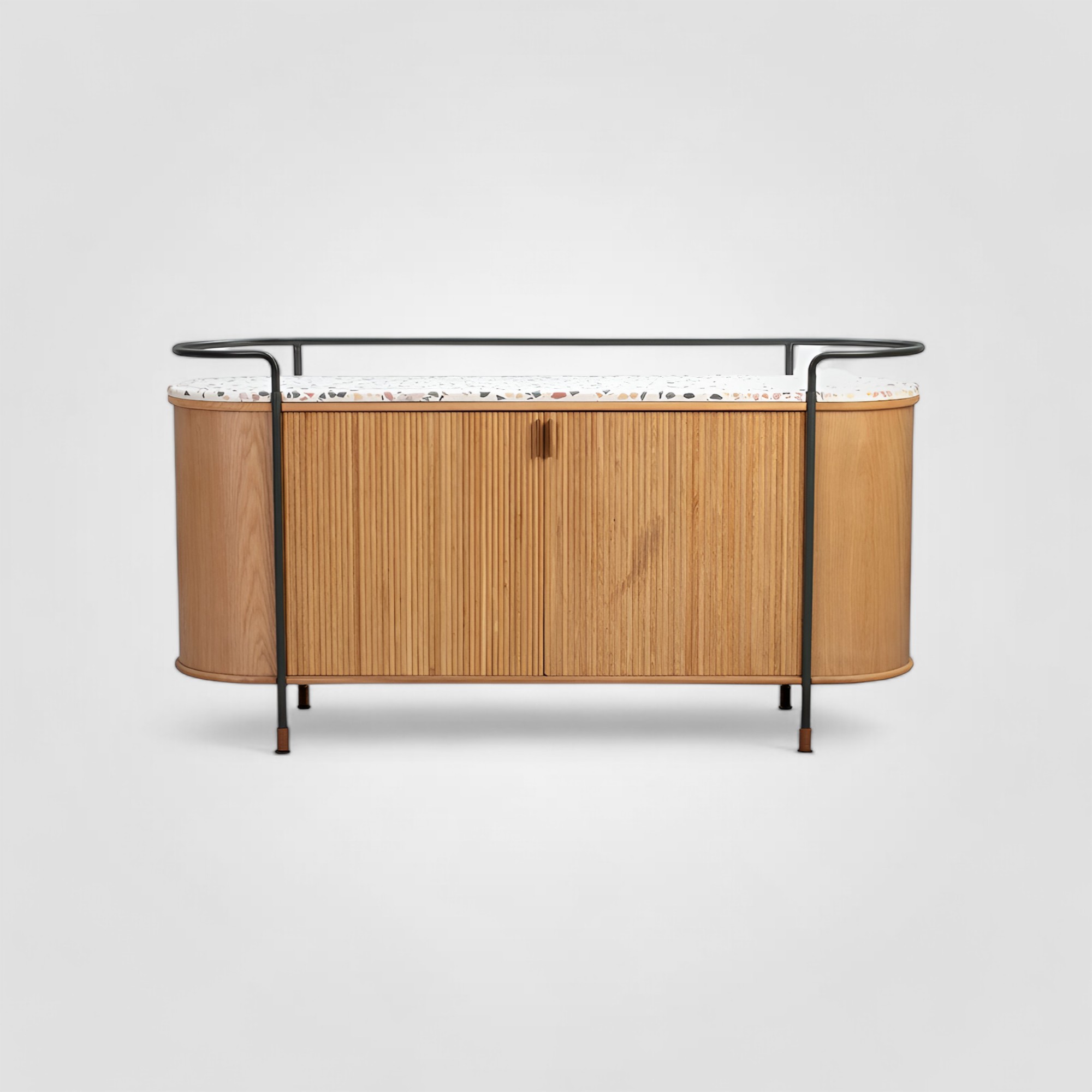 Шкаф-сервант, выполненный из массива и шпона дуба. Вместительные полки и ящики скрыты дверцами с фасадами, имитирующими роллеты. Металлические ножки цвета хаки имеют оригинальную форму, за счет чего играют роль внешнего декоративного каркаса и функционального ограждения края столешницы. Сама столешница изготовлена из полированного терраццо с имитацией камня. Нетривиальный внешний вид, необычные материалы и плавные линии формируют  яркую индивидуальность серванта. Особого внимания заслуживают уникальные декоративные наконечники на ножках, выполненные из кожаного жгута. Шкаф станет уникальным центральным элементом в лаконичном интерьере.
