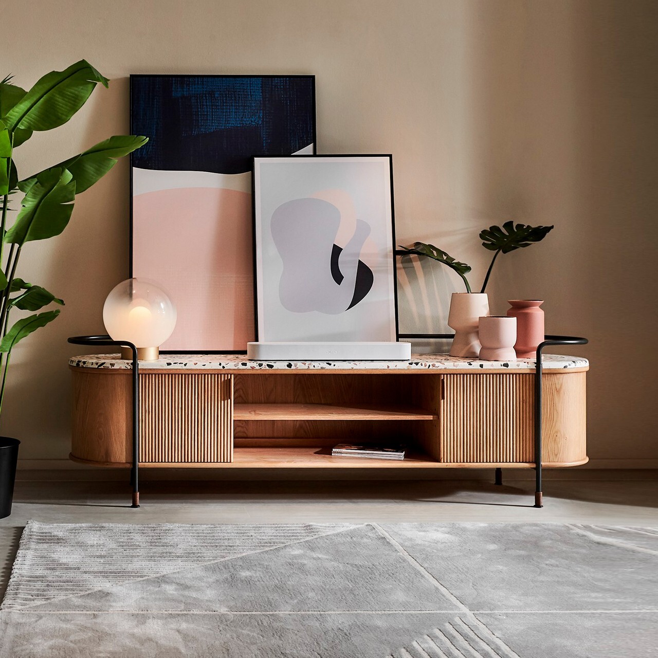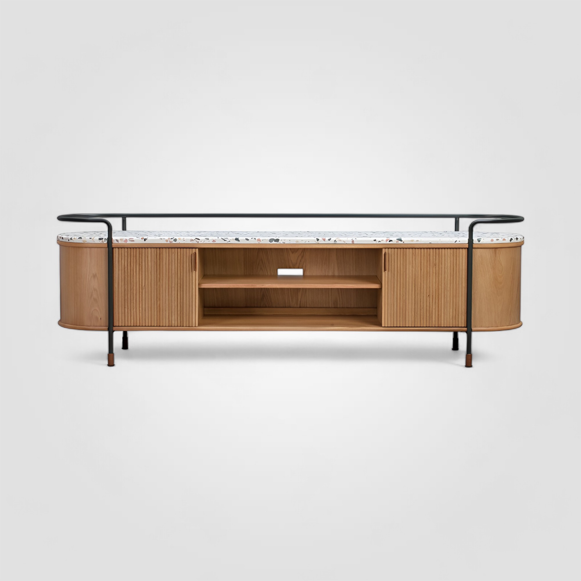 Тумба под телевизор из массива и шпона дуба. Широкая центральная полка идеально подойдет для комфортного хранения книг или журналов. Дополнительные полки скрыты дверцами с фасадами, имитирующими роллеты. Слитная внешняя конструкция из металла стильного цвета хаки играет роль ножек и удобного бортика по краю столешницы. Особую индивидуальность тумбе придает полированная столешница из терраццо с имитацией камня, а также уникальные наконечники, выполненные из кожаного жгута. Вместительная тумба привлекает внимание своим ярким характером, за счет чего способна сыграть центральную ноту в минималистичном интерьере.Вся коллекция TIERRA
