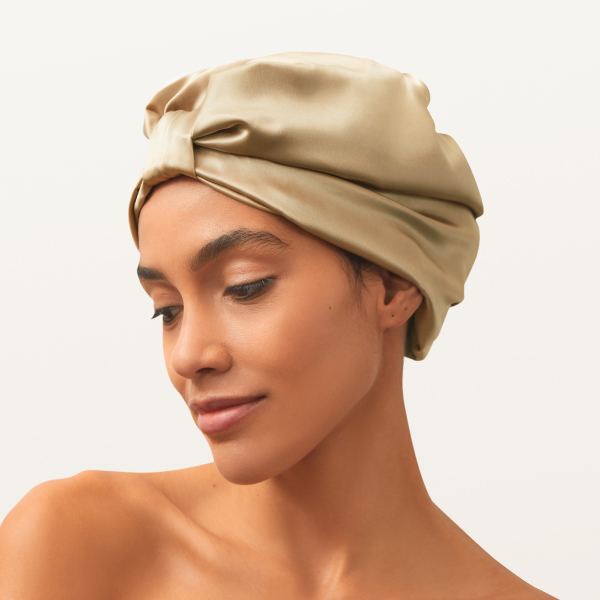 Un turban din mătase naturală învăluie delicat părul, protejându-l de