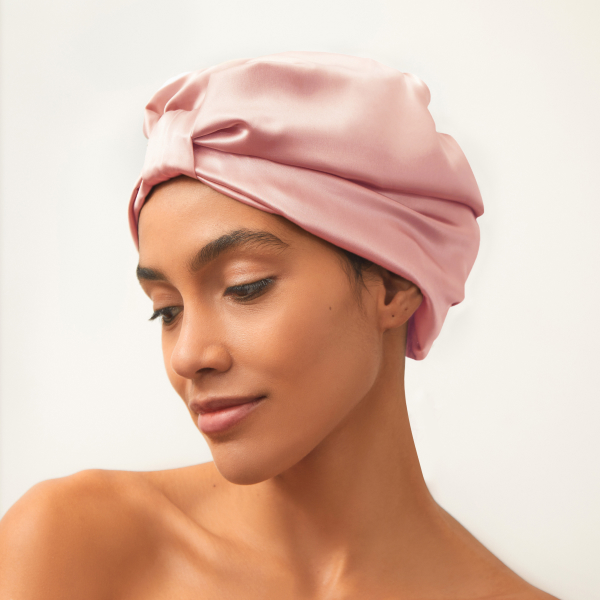 Un turban din mătase naturală învăluie delicat părul, protejându-l de