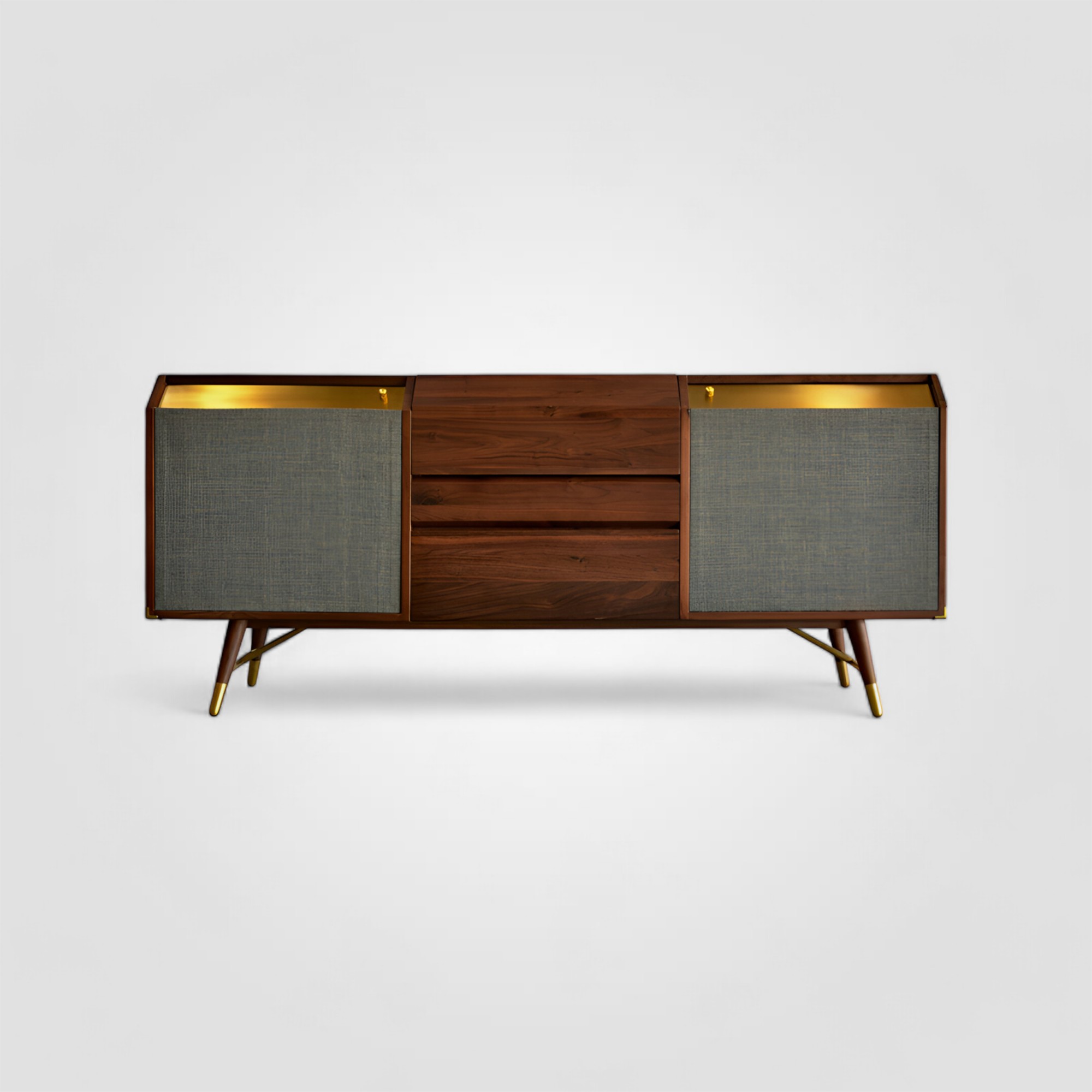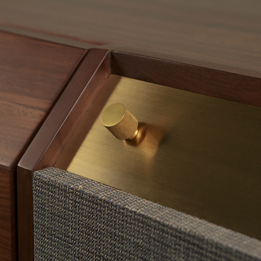 Шкаф-сервант из массива ореха и каучукового дерева. Центральный ящик серванта оснащен дверцей на доводчиках с вертикальным механизмом открывания. Благодаря вместительности и глубине ящик идеально подойдет для организации домашнего бара. Дополнительные зоны хранения представлены небольшим выдвижным ящиком и полками, скрытыми за оригинальными дверцами. Фасады дверей обтянуты тканью и дополнены металлическими панелями в цвет латунных наконечников. Эффектное сочетание форм и материалов формируют неповторимую индивидуальность серванта, воплощая современное прочтение стиля гранж. Шкаф привнесет в пространство особый характер в сочетании с другими предметами коллекции.