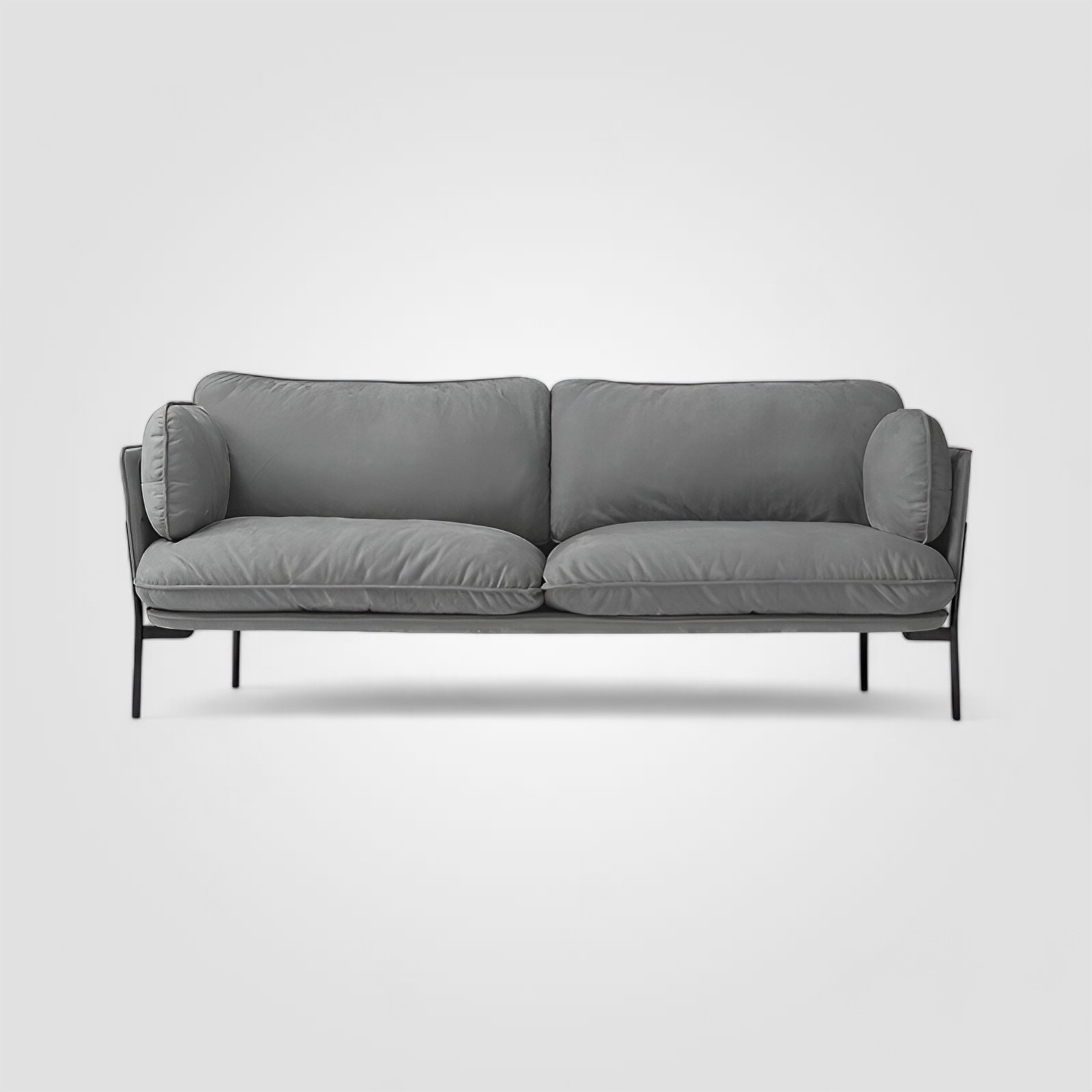 Просторный двухместный диван с тонкими металлическими ножками, которые создают эффект легкости и парения. Жесткий каркас в тканевой обивке формирует структуру силуэта модели и гармонично уравновешивает пышные, объемные подушки. Основание дивана зафиксировано скрытыми липучками, верхние подушки съемные. За счет практичной обивки диван послужит прекрасной основой организации зоны отдыха и выгодно подчеркнет цветовые акценты в интерьере.