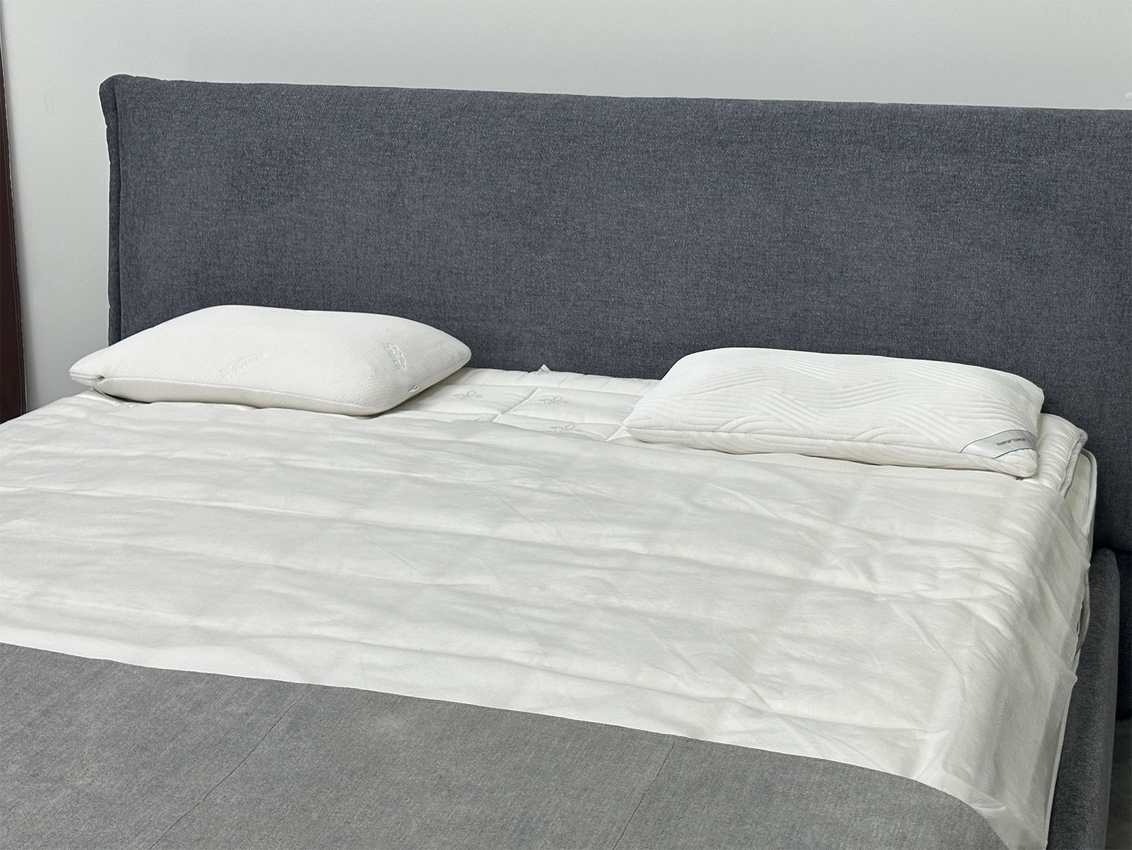 Обивка кровати: модная фактурная высококачественная мягкая рогожка-велюр светло-серого цвета.