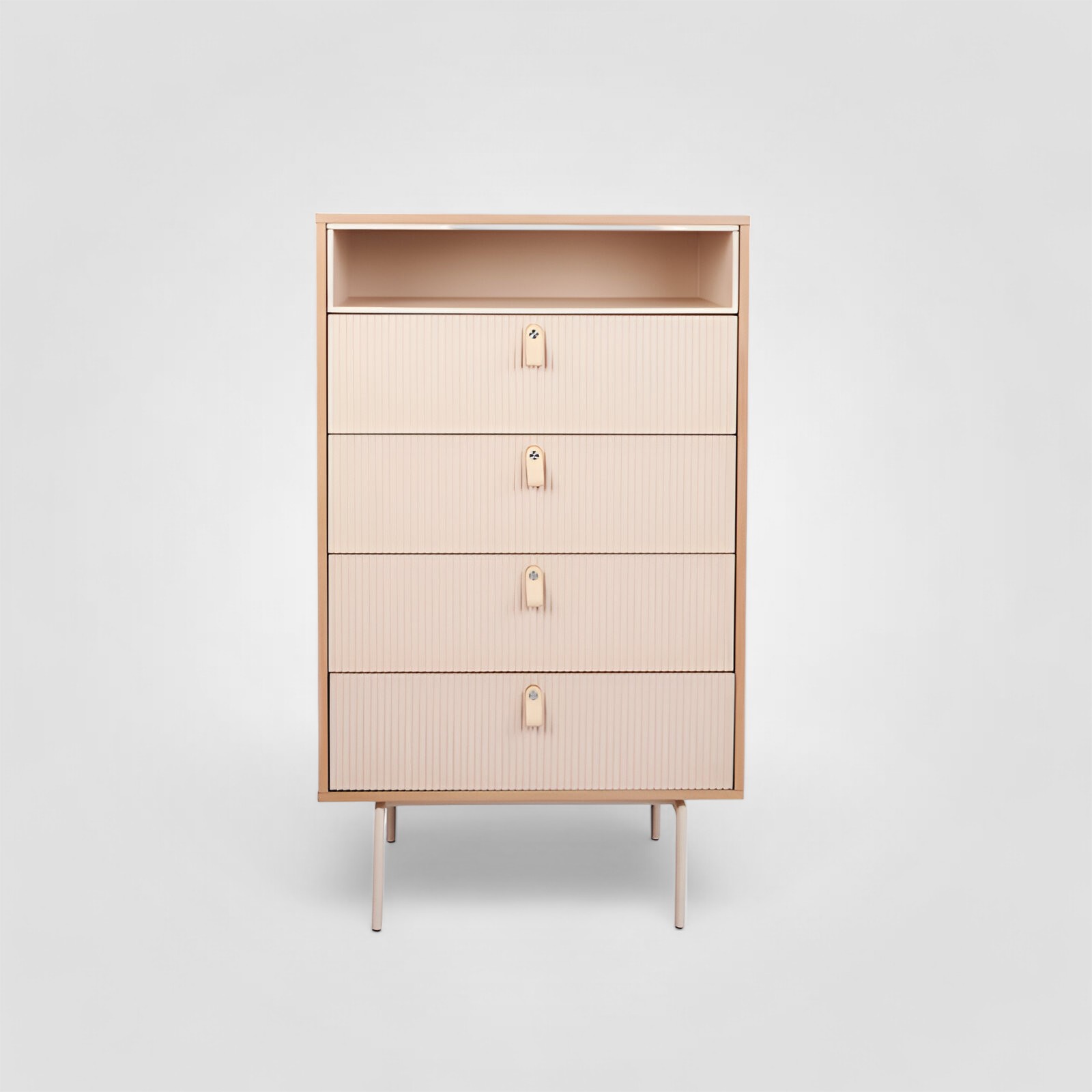 Элегантный комод из коллекции Creme создан для светлых, уютных интерьеров в современном скандинавском стиле. В нём сочетаются изысканность и компактность и вместительность.Конструкция – шпон дуба. Ножки – металл с глянцевым покрытием. Ручки ящика – натуральная кожа.