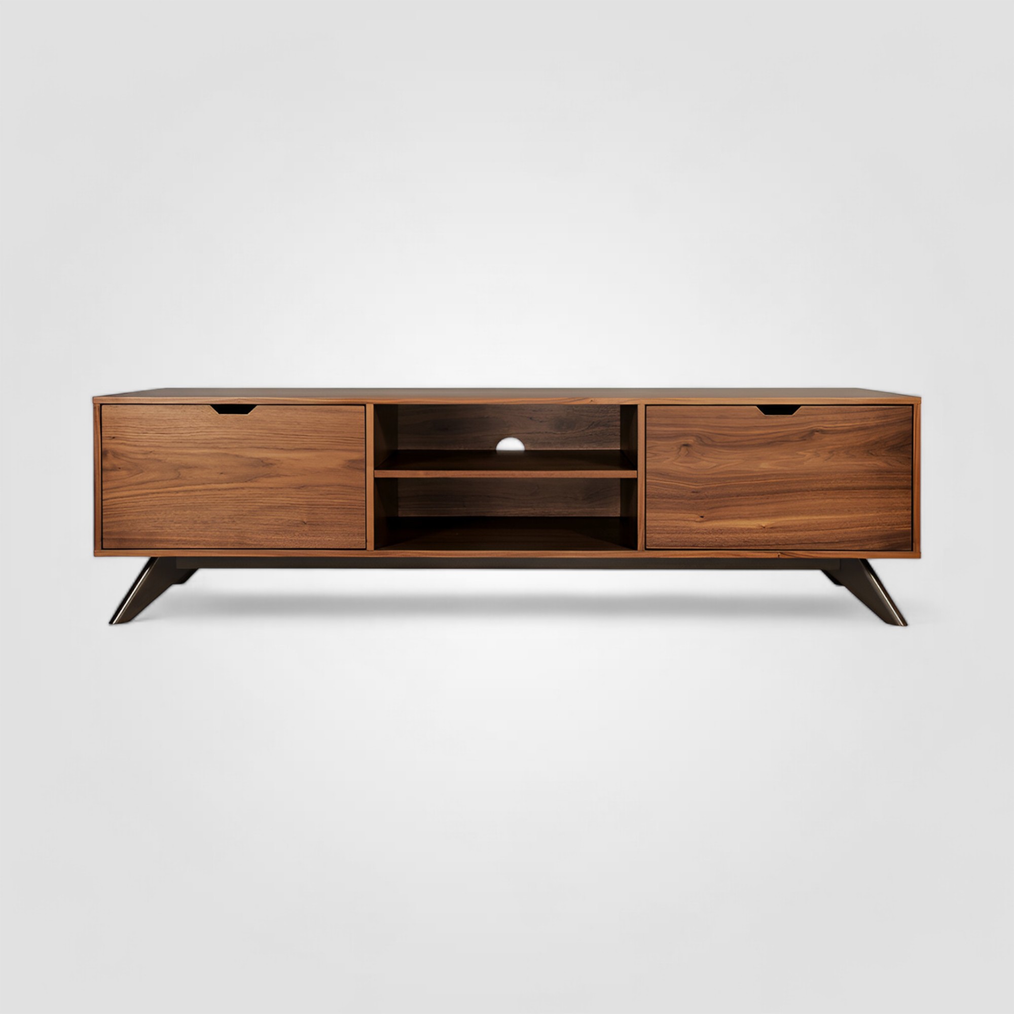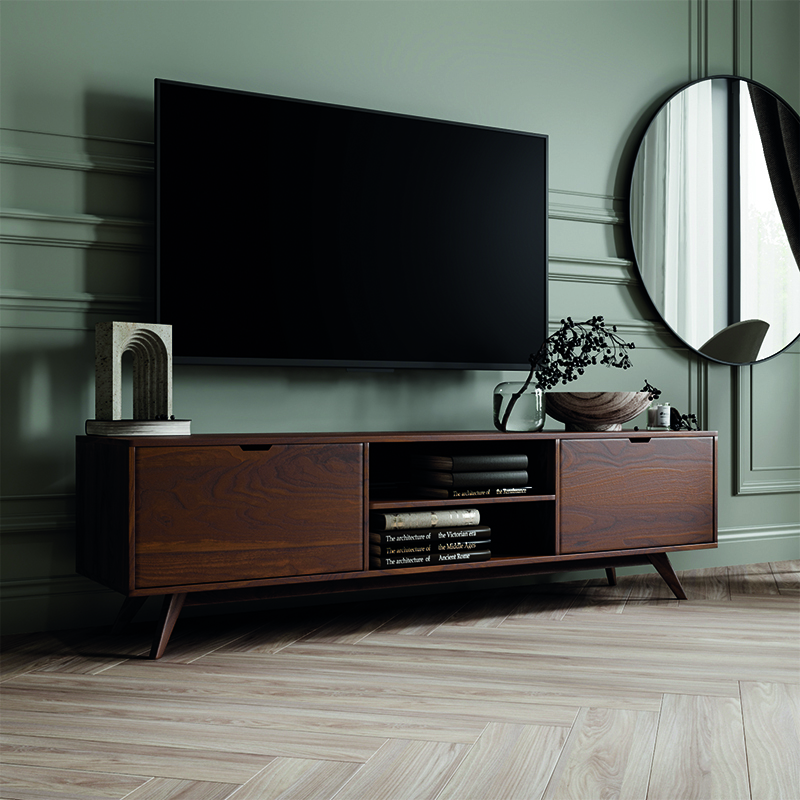 Тумба под телевизор из массива дерева и шпона ореха. Удобные вместительные полки, две из них скрыты лаконичными дверцами на мягком ходу с удобными прорезными ручками. Современный, сдержанный дизайн тумбы позволяет вписать изделие в любой интерьер. Оригинальные ножки, расположенные под наклоном, дополняют внешний вид тумбы. Гладкие поверхности цвета теплого дерева и строгие линии создают неповторимый характер с нотками винтажности и привносят атмосферу уюта. Тумба идеально дополнит интерьер просторной гостиной или спальни. Ее можно использовать как самостоятельно, так и в сочетании с другими предметами коллекции.