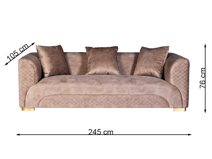 Невероятно красивый трехместный диван станет центром уюта и покоя в гостиной или столовой. Мягкое сиденье, широкая спинка, переходящая в подлокотники, и три декоративные подушки радуют глаз и душу. Вся обивка с наружной стороны и оригинальная вставка в цокольной части дивана прострочены небольшими ромбами. Широкие ножки из сатинированной стали золотистого цвета гармонируют с восхитительным бежевым велюром превосходного качества. В каждом элементе отделки чувствуется изысканный дизайнерский стиль; композиция дивана пленяет гармонией и законченностью. На нашем сайте вы найдете журнальные и кофейные столы, светильники и зеркала с отделкой под матовое золото, чтобы дополнить меблировку красивыми предметами интерьера в стилистике ар-деко.