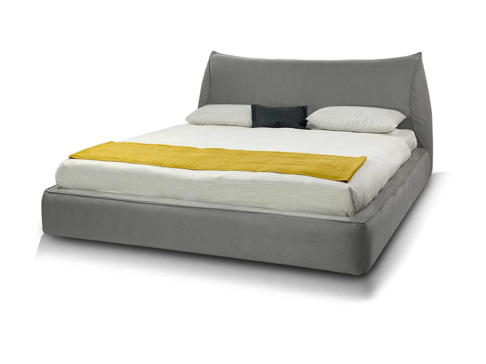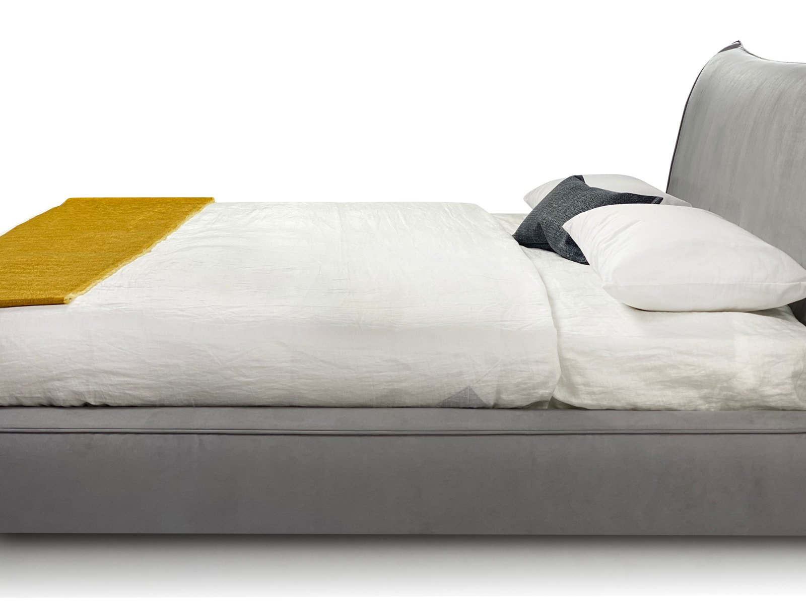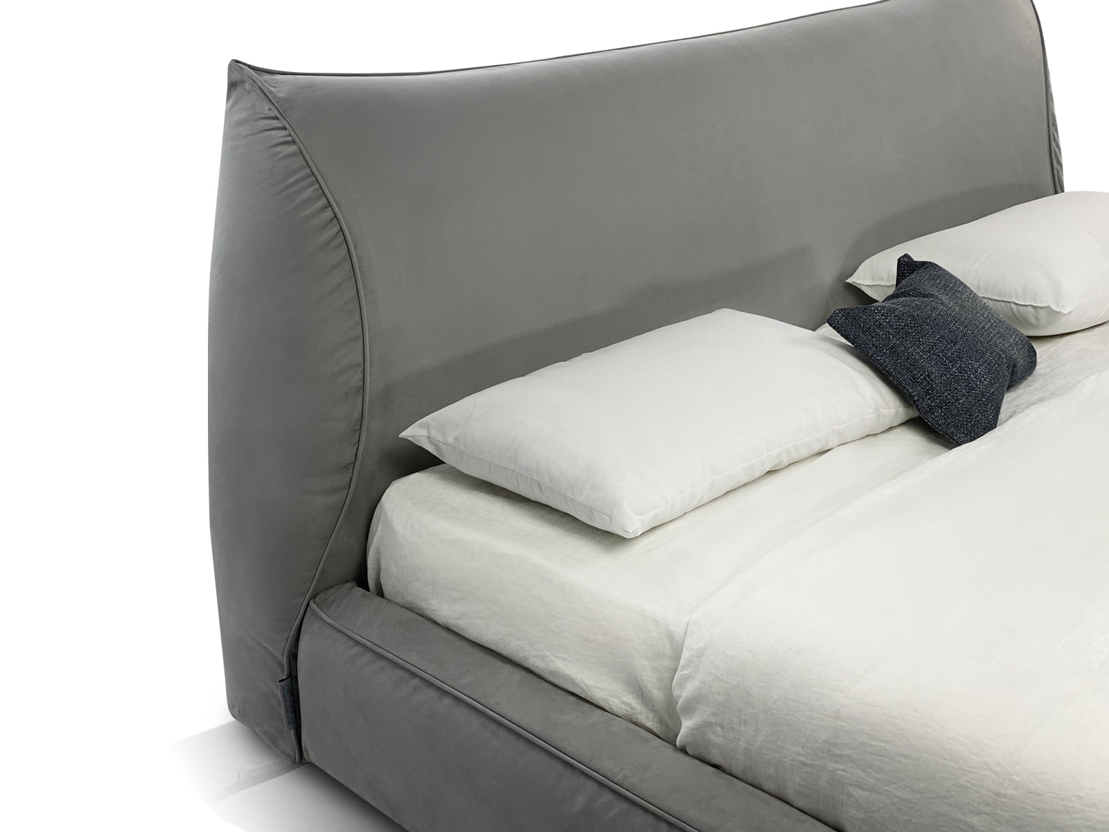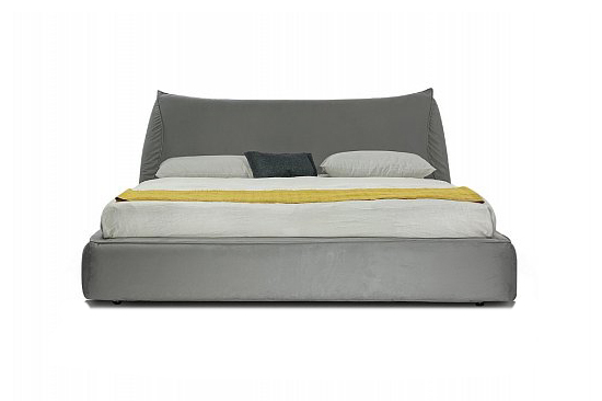 Особенности дизайна: объемная интегрированная в изголовье плотная подушка, не теряющая форму  (внутри подушки монолитный блок из холодной пены) со скошенными углами и прямыми линиями швов по царгам создают графичный дизайн.  Стиль имеет свое продолжение в боковинах кровати.