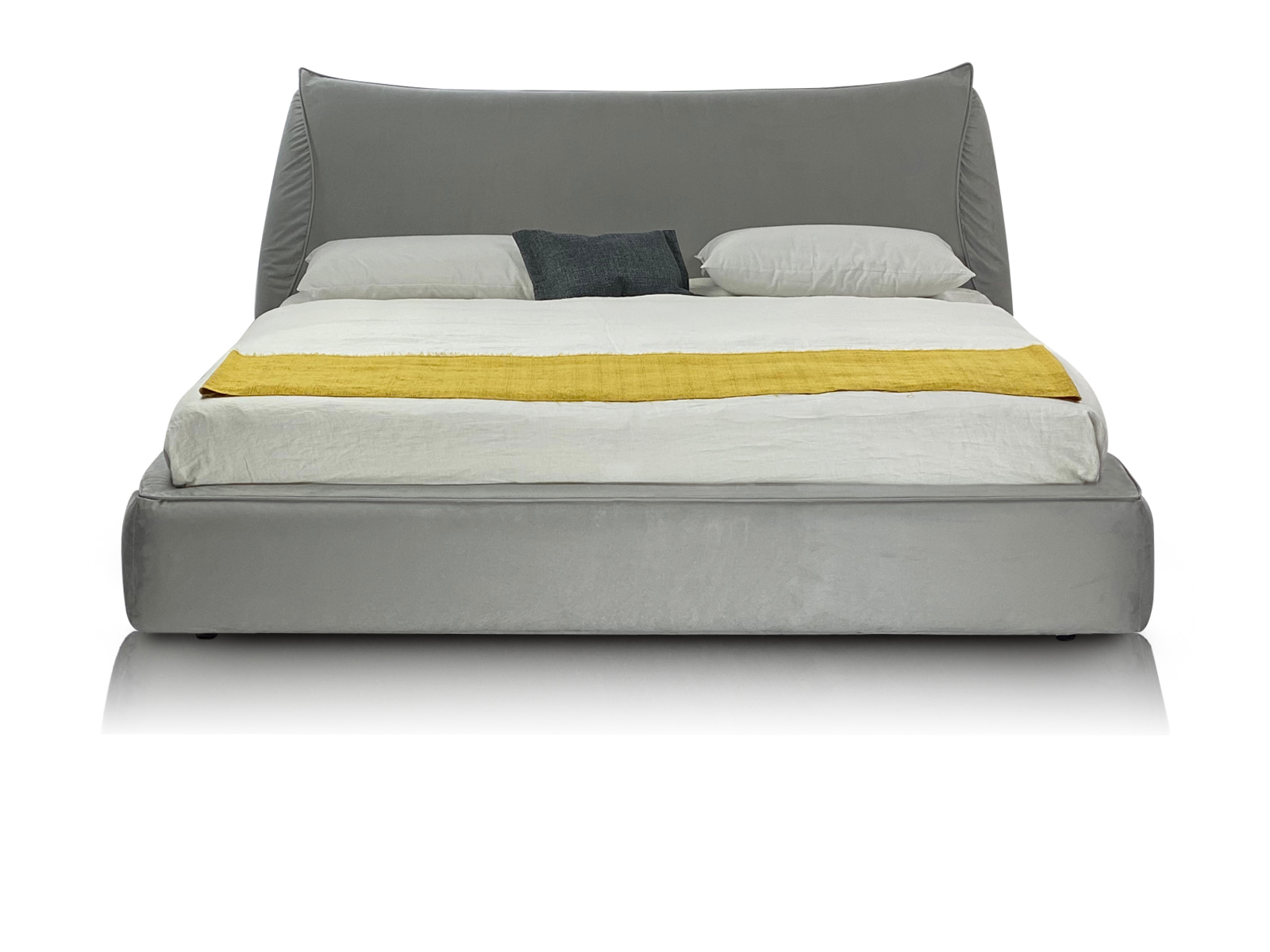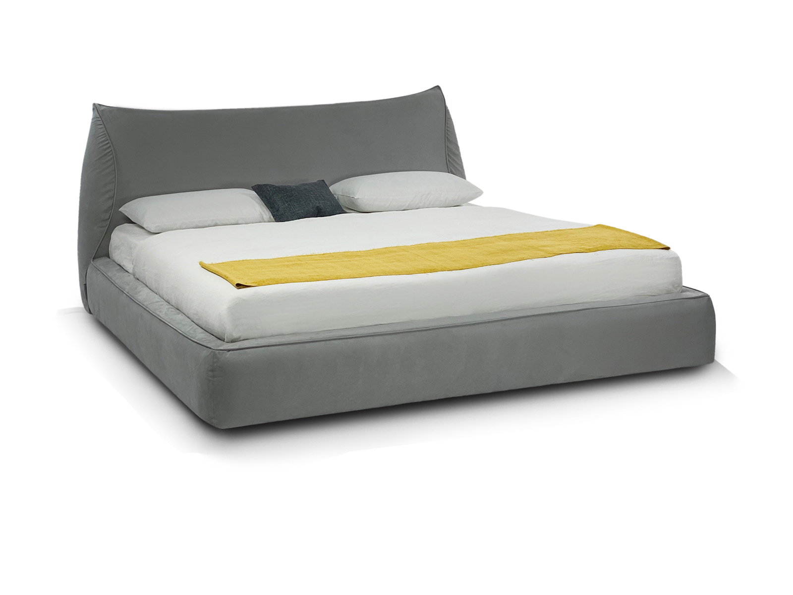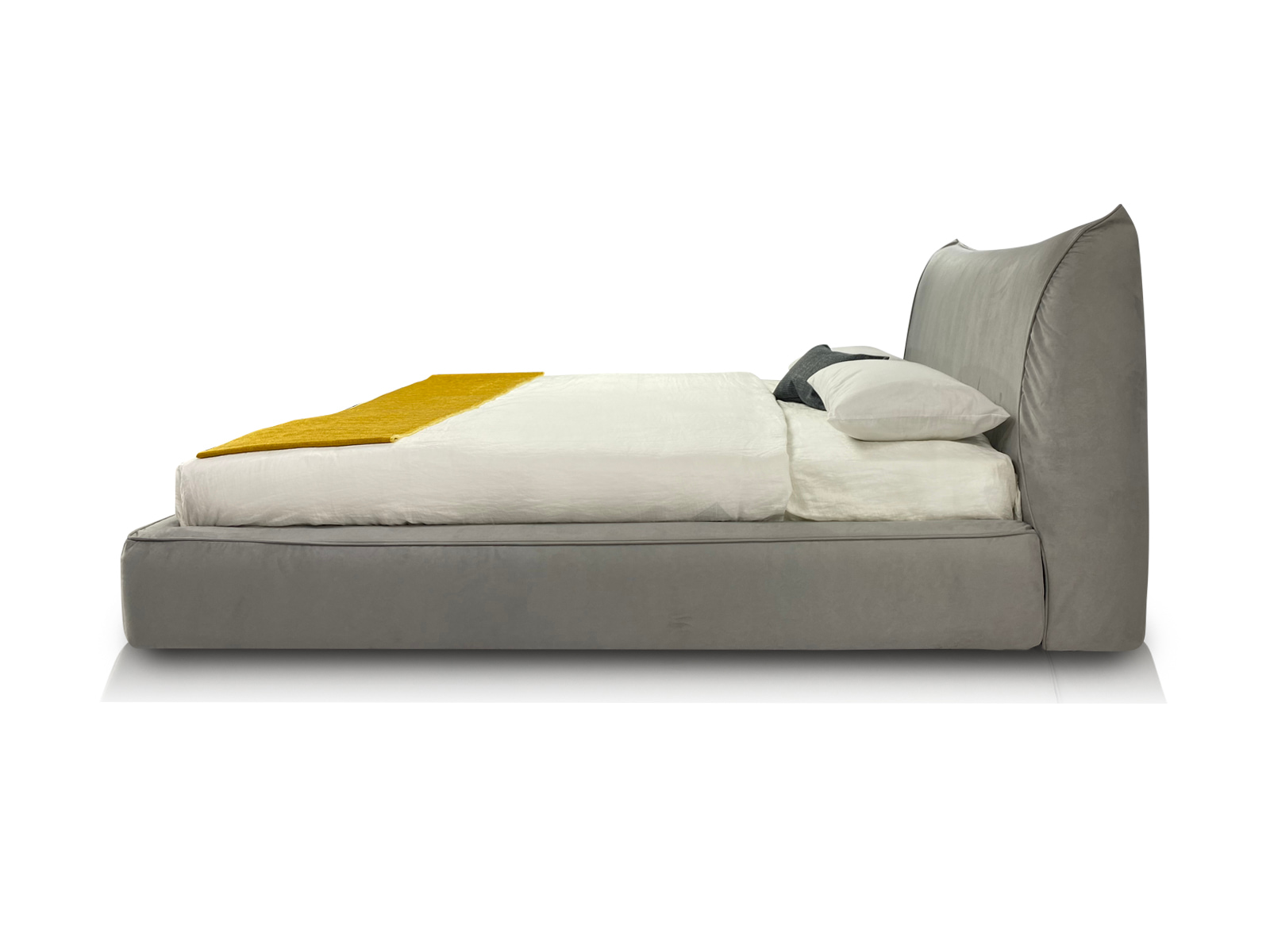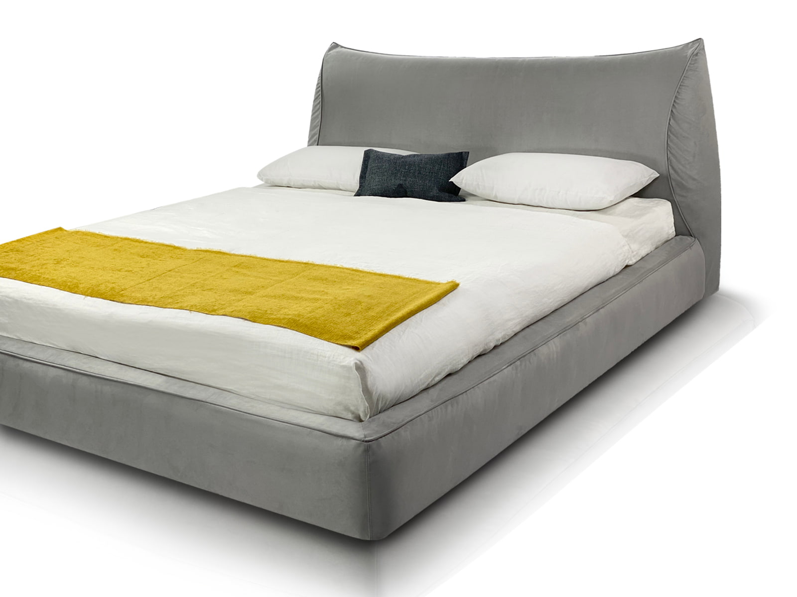 Особенности дизайна: объемная интегрированная в изголовье плотная подушка, не теряющая форму  (внутри подушки монолитный блок из холодной пены) со скошенными углами и прямыми линиями швов по царгам создают графичный дизайн.  Стиль имеет свое продолжение в боковинах кровати.