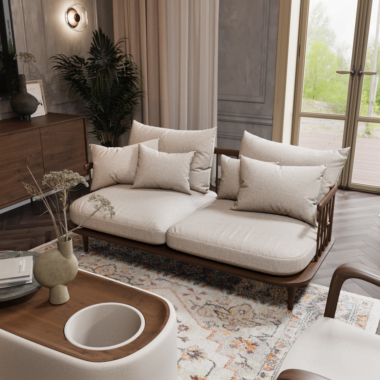 Просторный двухместный диван со съемными подушками в скандинавском стиле. Знаковое для стиля нордик лаконичное основание с решетчатой спинкой выполнено из массива ясеня. Мягчайшие, пышные подушки сиденья и спинки с обивкой из фактурной ткани серо-бежевого цвета дополняют тон дерева. Диван привнесет атмосферу тепла и комфорта в пространство гостиной, станет центральным элементом в зоне отдыха на веранде или крытой террасе загородного дома. Может быть стилистически дополнен креслом из одноименной коллекции.