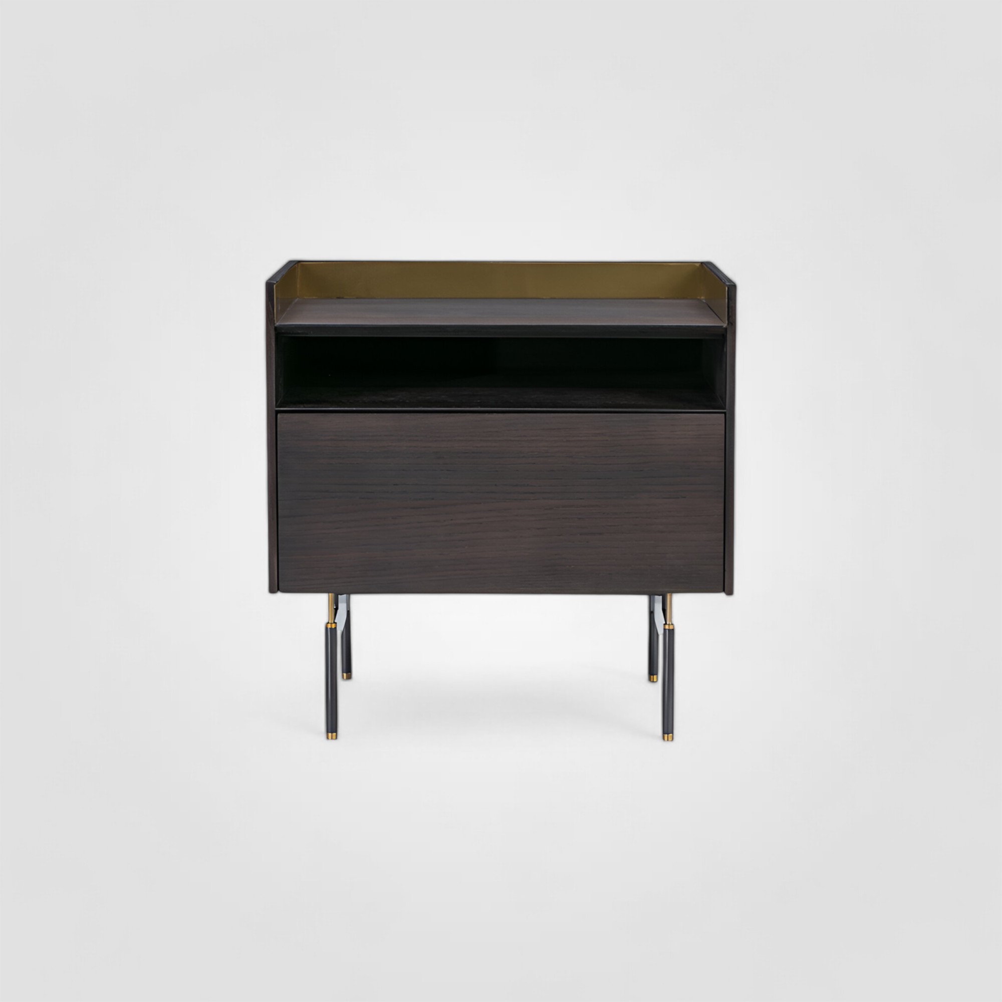 Прикроватная тумба LINATE из шпона дуба с латунными вставками. Коллекция разработана в современном стиле, отличается особым дымчатым цветом корпуса с деликатно проступающей текстурой древесины, а также декоративными элементами из латуни и уникальными ножками из стали. Благодаря таким нарочито тонким ножкам и простой, но основательной форме всей конструкции, тумба выглядит так, будто она «парит» над полом, ярко демонстрируя и подчеркивая свой особенный дизайн.