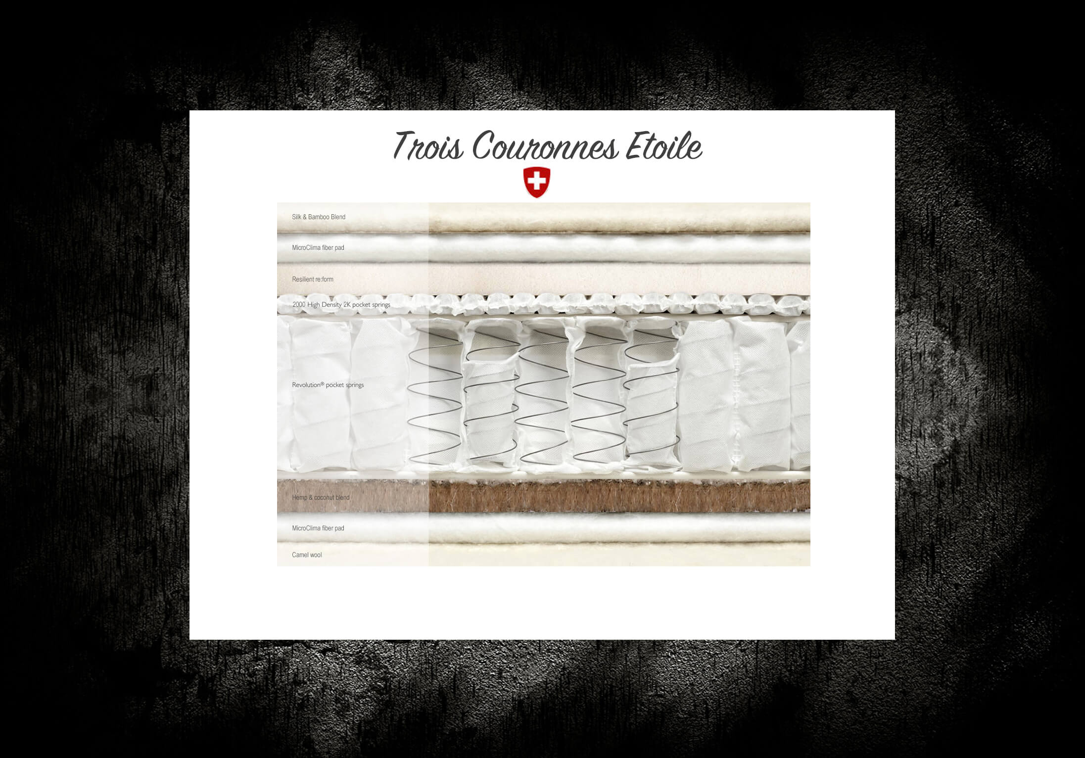 В качестве основы матраса Trois Couronnes Etoile используется уникальная конструкция из двойных независимых пружин Revolution® совместно с системой мини пружин 2000 High Density® диаметром 22 мм , прошедших процесс печной закалки, что обеспечивает защиту от деформации и позволяет производителю давать пожизненную гарантию на пружинные блоки в своих матрасах.