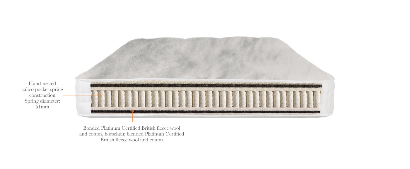 Нижний слой – это смесь мягкой шерсти, белого хлопка и натурального конского волоса, прошитых вручную через лен.