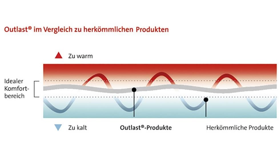 Материалы с фазовым переходом (PCM) поглощают избыточное тепло, сохраняют его и снова отдают. Это приводит к постоянному комфортному контуру, температура которого активно регулируется. Поскольку технология Outlast® теперь применяется непосредственно в ткани, этот эффект усиливается и обеспечивается равномерно по всей поверхности покрытия.