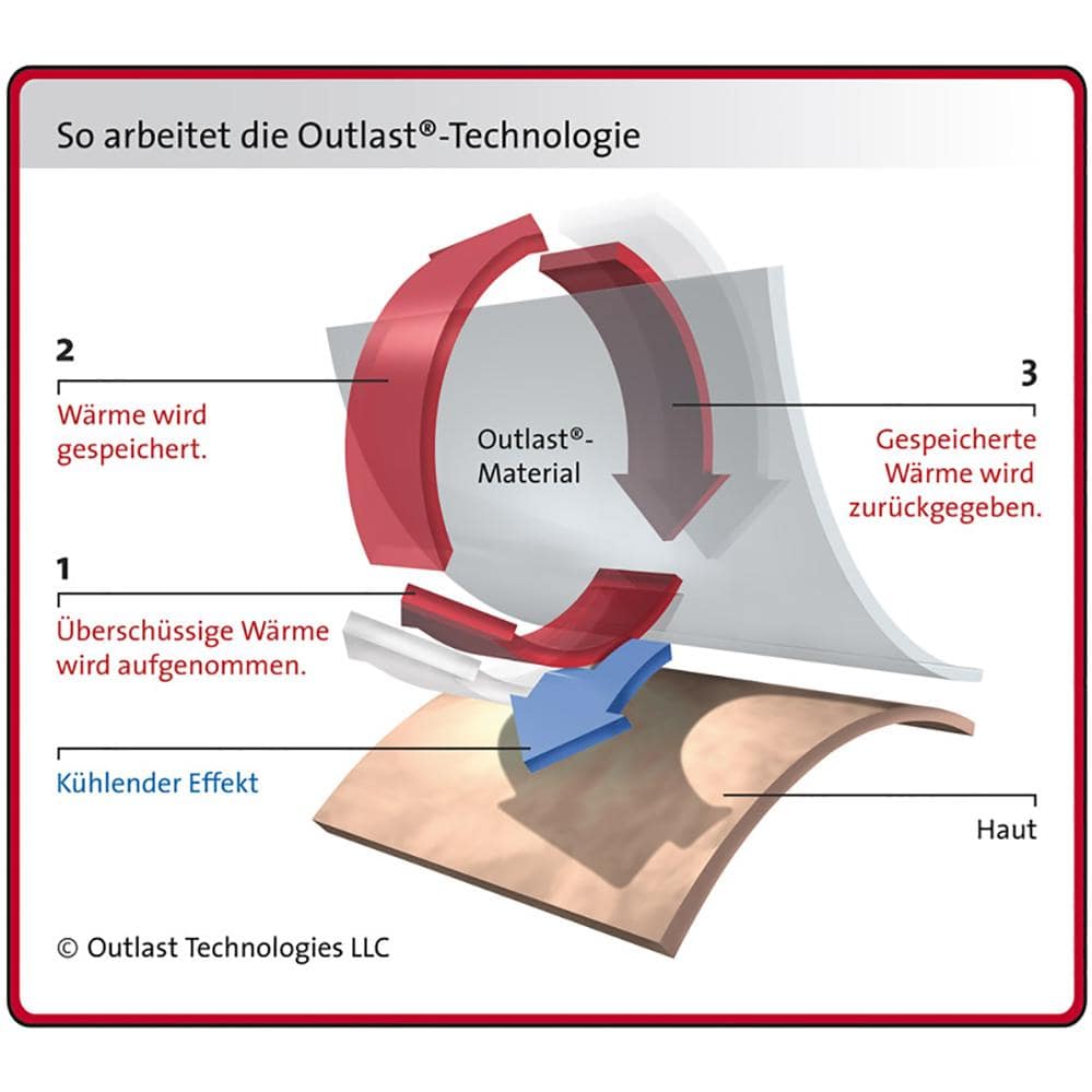 Материалы с фазовым переходом (PCM) поглощают избыточное тепло, сохраняют его и снова отдают. Это приводит к постоянному комфортному контуру, температура которого активно регулируется. Поскольку технология Outlast® теперь применяется непосредственно в ткани, этот эффект усиливается и обеспечивается равномерно по всей поверхности покрытия.