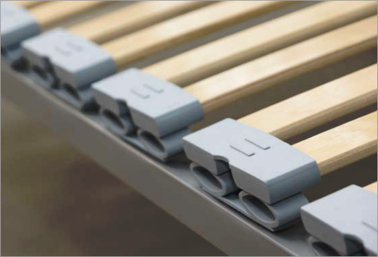 Латодержатели (крепление для ламели) изготовлены из термопластичного эластомера, каучуковые спаренные (по 2 шт.) латодержатели с амортизатором INDURUB с повышенной степенью комфорта, что делает их абсолютно бесшумными для ламелей шириной 35 мм.