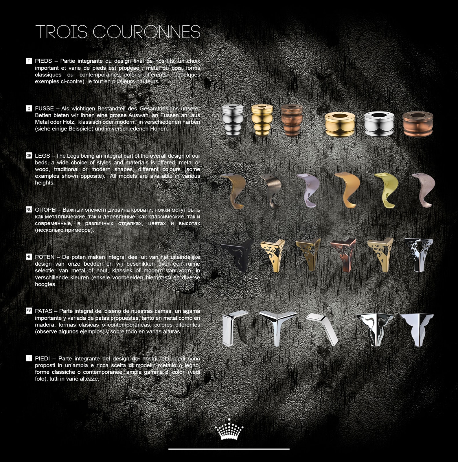 Подчеркнуть великолепие спальной системы Trois Couronnes помогут ножки, идеально подходящий под интерьер и стиль жизни аристократов мира.  Выбирая дизайн и цвет ножек - основание кардинально изменяет свою стилевую напрвленность и вписывается в самые разные интерьеры, будь то современная классика или что то другое.  Деревянные ножки могут быть представлены в разных вариантах и с разными отделками: натуральное дерево, красное дерево, эбеновое дерево и сталь.  Широкая гамма изысканных и натуральных материалов может быть дополнена бронзой, такой модной в 2018г. или хромированной отделкой.