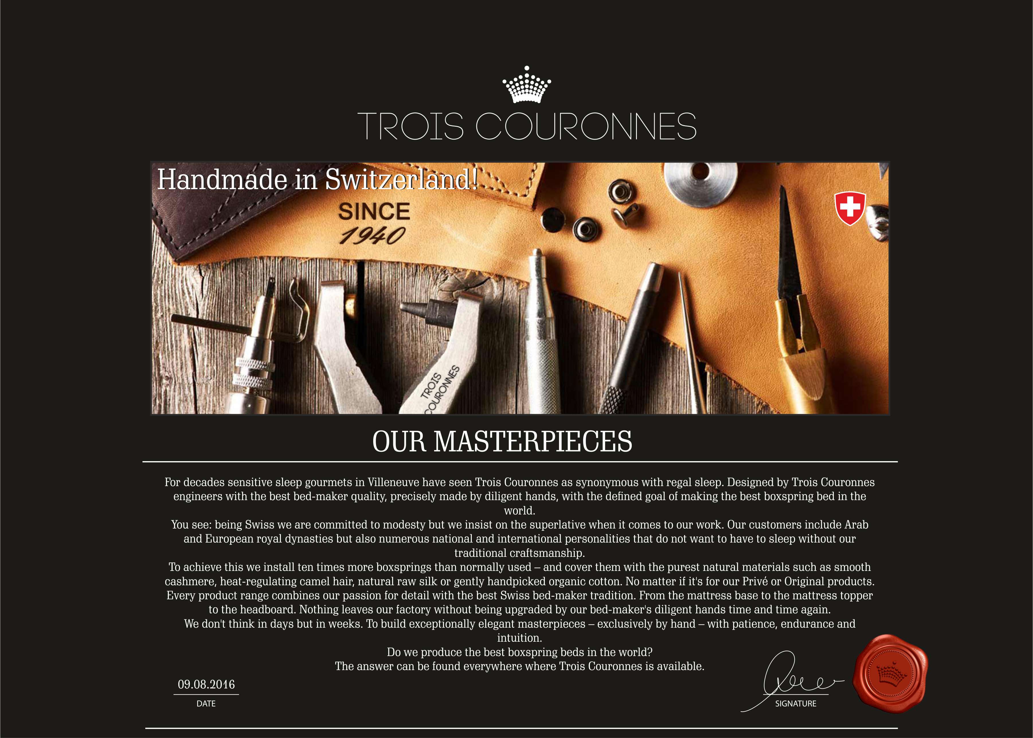 Основание Trois Couronnes - спроектировано и произведено в Швейцарии с самыми жесткими и строгими критериями прочности, надежности, длительности использования.  Его конструкция гарантирует эргономичность и большую износостойкость и стабильность матрасу.  Благодаря продуманной конструкции - основание не будет скрипеть и издавать звуки во время эксплуатации на протяжении всего срока эксплуатации. Также, оно не имеет ограничений по нагрузке, что позволяет предоставлять фабрике Trois Couronnes  пожизненную гарантию на спальную систему (комплект: основание + матрас).