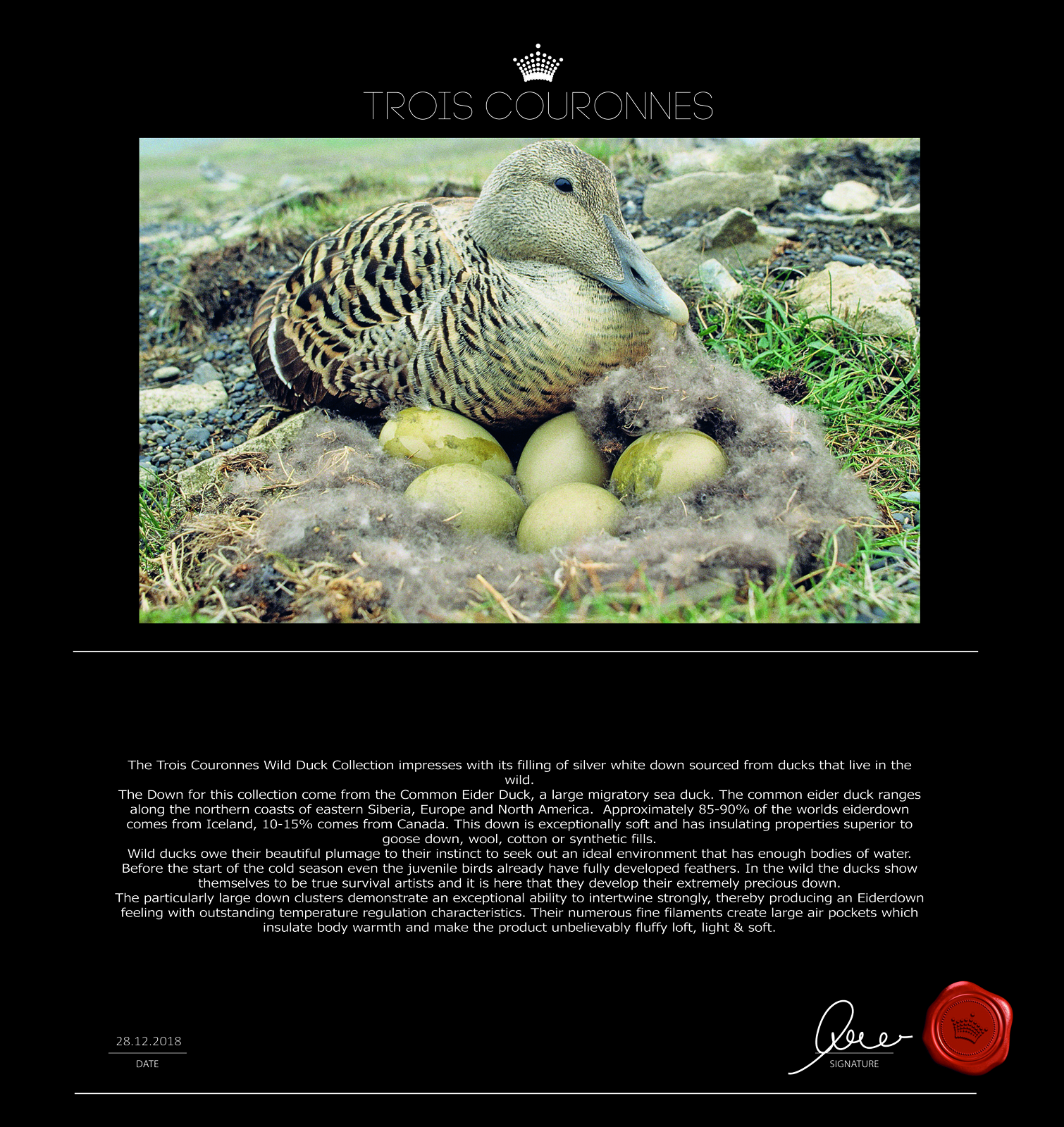 Швейцарская компания Trois Couronnes, основанная в середине 1940  годах как семейное предприятие, ‒ всемирно известный производитель постельных принадлежностей премиум-класса. Кредо фабрики: "Мастерство, традиции и роскошь в инновационном воплощением с вниманием к каждой детали". Trois Couronnes гарантирует высшее качество своей продукции.