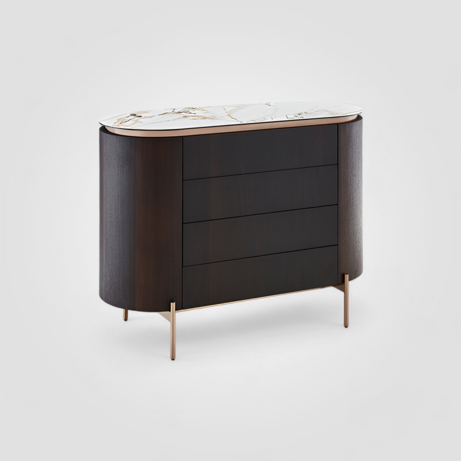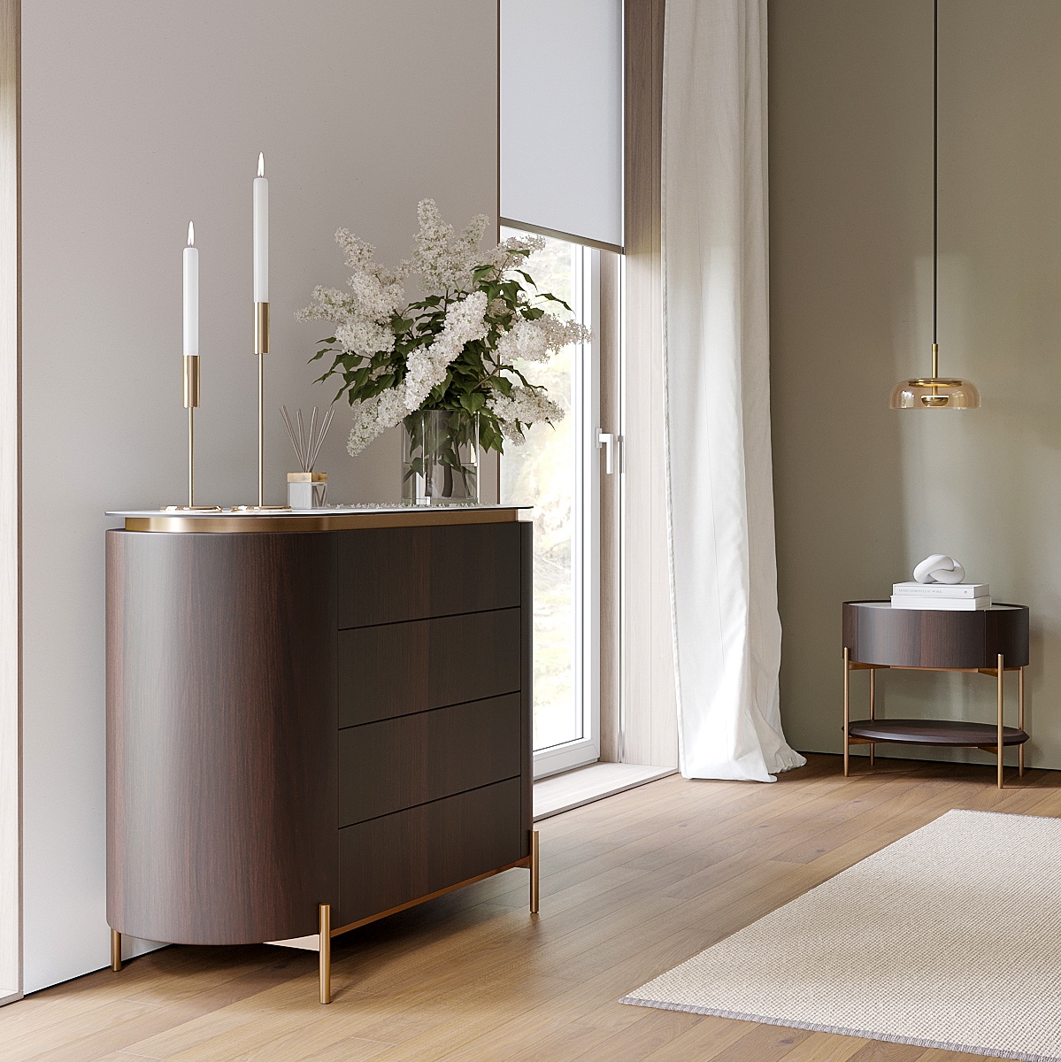 Комод SENDAI воплощает в себе бескомпромиссное качество и роскошь. Созданный из только самых высококачественных материалов, он является истинным произведением мебельного искусства. Мраморная столешница придает комоду утонченность и элегантность, при этом служит практичной поверхностью для размещения разнообразных предметов. Отделка из нержавеющей стали цвета латуни придаёт этому комоду особую привлекательность и шарм. Благодаря этой отделке, комод приобретает неповторимый эстетический вид, который безусловно привлечет внимание и восхищение окружающих. Яркий цвет ореха в сочетании с металлическими акцентами создает элегантный и роскошный образ комода. Это безупречное сочетание материалов и цветов открывает возможности для его использования в любом интерьере, добавляя в него элегантности и изысканности. Все эти характеристики делают этот комод идеальным выбором для тех, кто стремится к изысканной и роскошной мебели. Он не только отлично выполняет свою функцию хранения, но также становится центральным предметом в интерьере, подчеркивая роскошь и вкус своего владельца.