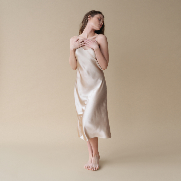 Классическая идеальная шелковая сорочка с неглубоким V-образным вырезом на тонких регулируемых бретелях в минималистичном стиле. Комфортно облегает силуэт, нежный  шелк поддерживает оптимальную для тела температуру, чтобы вы чувствовали себя роскошно.
