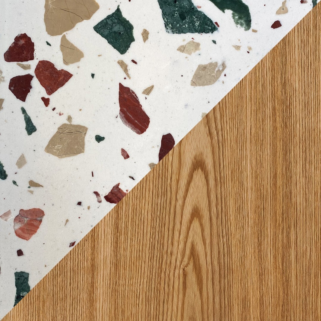 Тумба под телевизор из массива и шпона дуба. Широкая центральная полка идеально подойдет для комфортного хранения книг или журналов. Дополнительные полки скрыты дверцами с фасадами, имитирующими роллеты. Слитная внешняя конструкция из металла стильного цвета хаки играет роль ножек и удобного бортика по краю столешницы. Особую индивидуальность тумбе придает полированная столешница из терраццо с имитацией камня, а также уникальные наконечники, выполненные из кожаного жгута. Вместительная тумба привлекает внимание своим ярким характером, за счет чего способна сыграть центральную ноту в минималистичном интерьере.